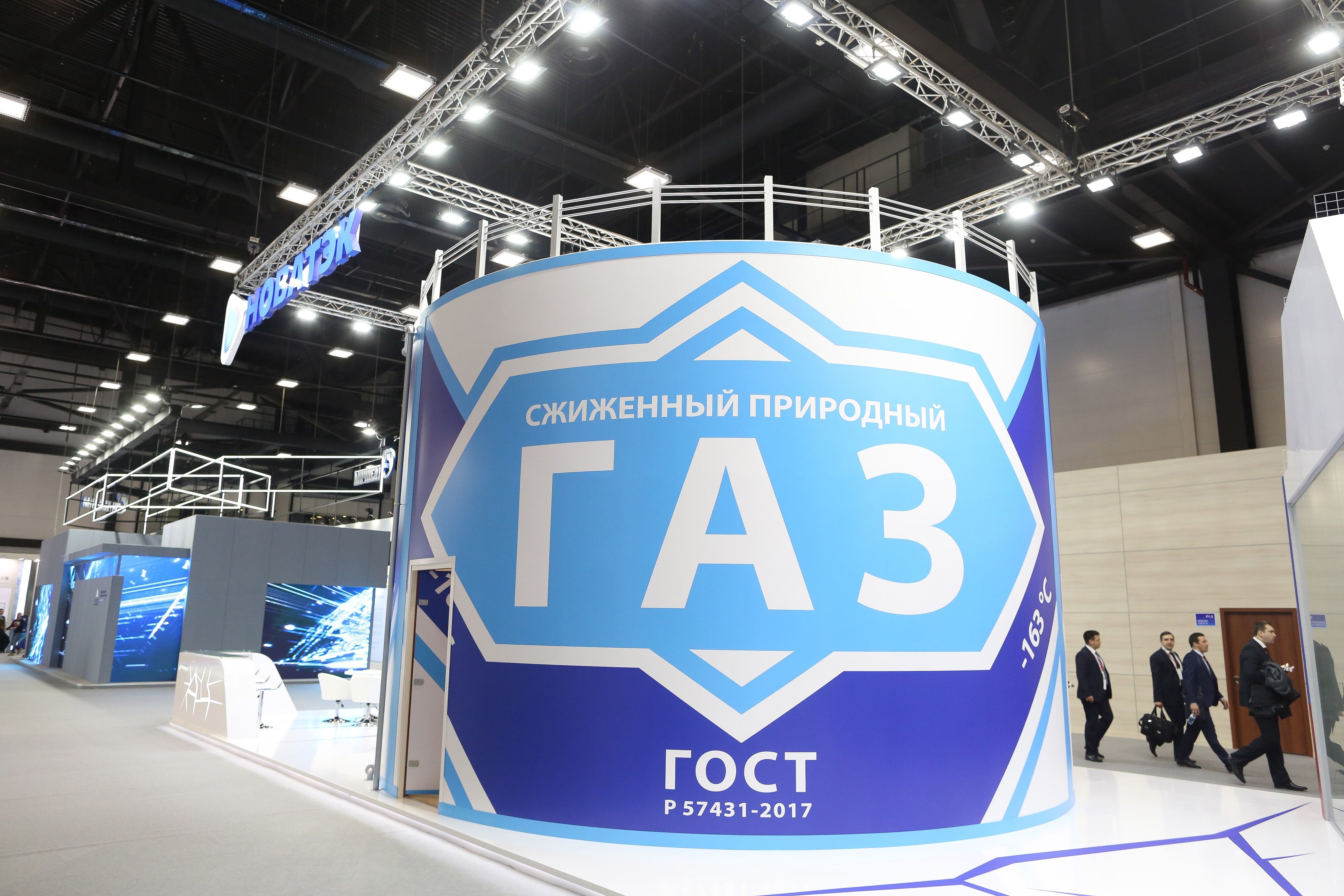 A model gas storage tank sits on display at the Novatek PJSC corporate pavilion at the International Arctic Forum in St. Petersburg. (Photographer: Andrey Rudakov/Bloomberg)