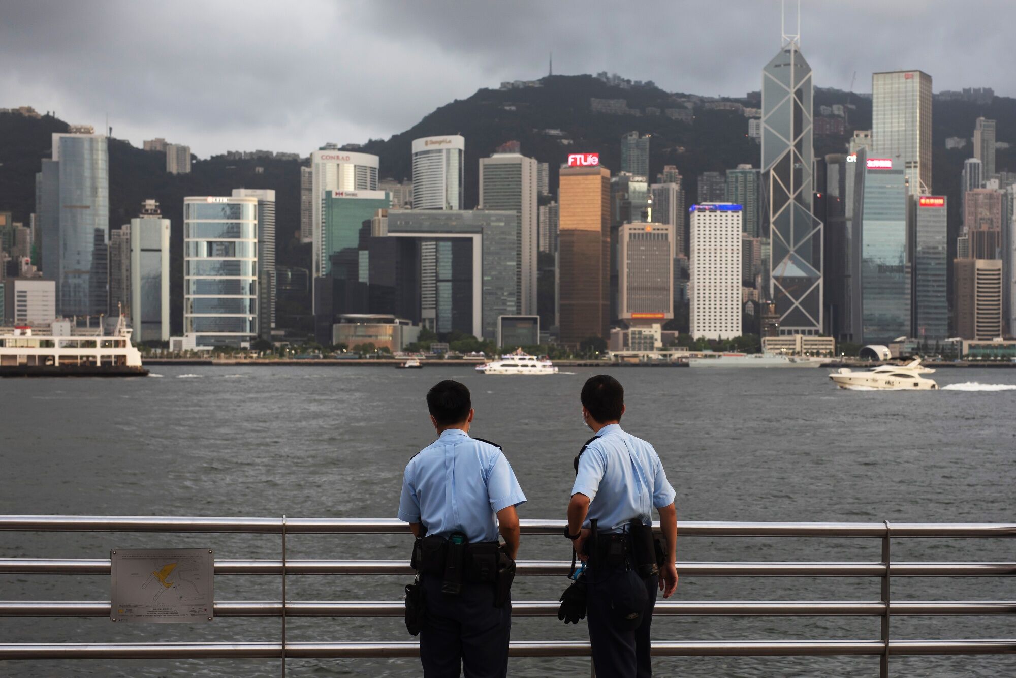 Police officers stand guard in front of the skyline at Tsim Sha Tsui in Hong Kong, China, on Thursday July, 1, 2021. Hong Kong's leader pledged to press ahead with an unprecedented national security crackdown, as the Asian financial center marked a series of fraught anniversaries symbolizing Beijing's tightening grip over local affairs. Photographer: Paul Yeung/Bloomberg