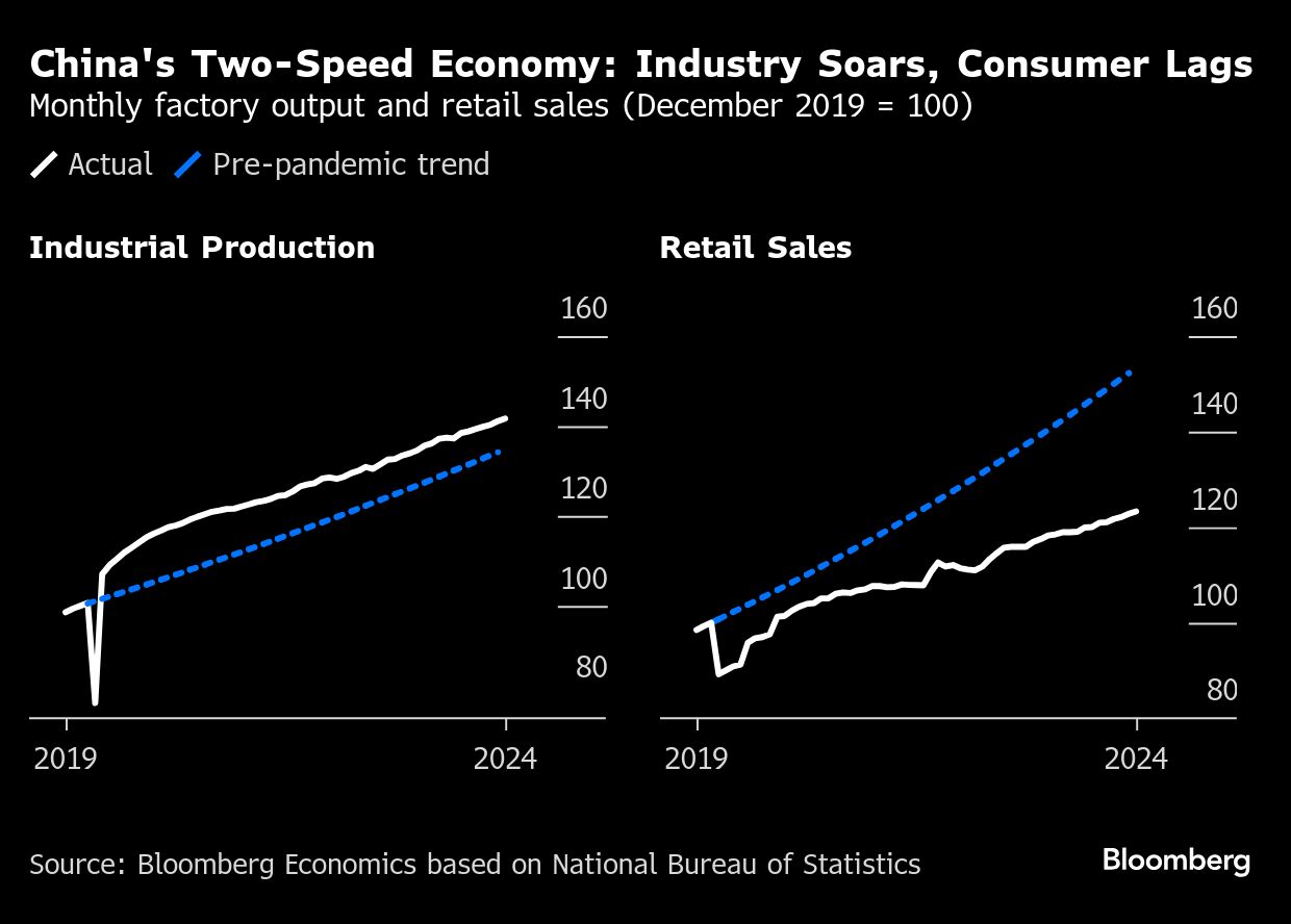 (Bloomberg) -- China's top leaders have signaled stronger stimulus to help fill a hole in consumer demand. That doesn't mean Beijing will roll out a “bazooka” package just yet, or abandon its factory focus.