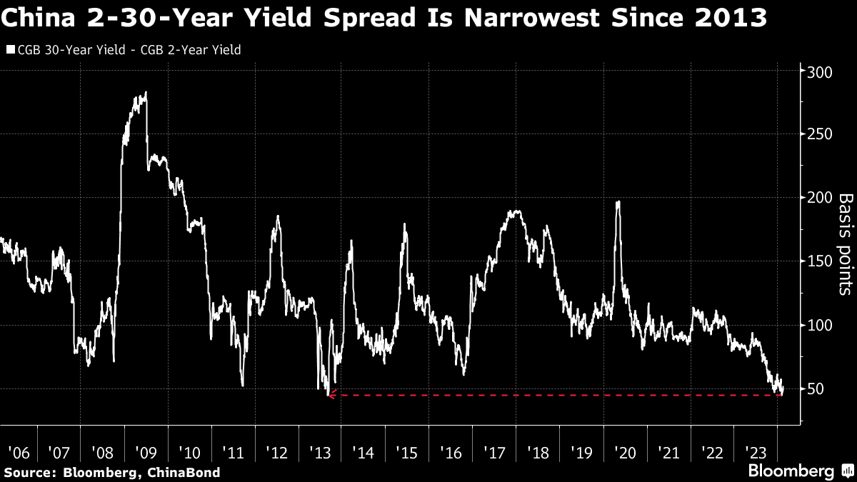 The extra yield on the nation's 30-year bonds over their two-year peers has been shrinking for more than a year and this month slipped to the narrowest in more than a decade. That suggests traders are increasingly pessimistic about the growth outlook due to a chronic property crisis and persistent deflation. Many analysts see the curve remaining relatively flat as expectations for easing keep being set back.