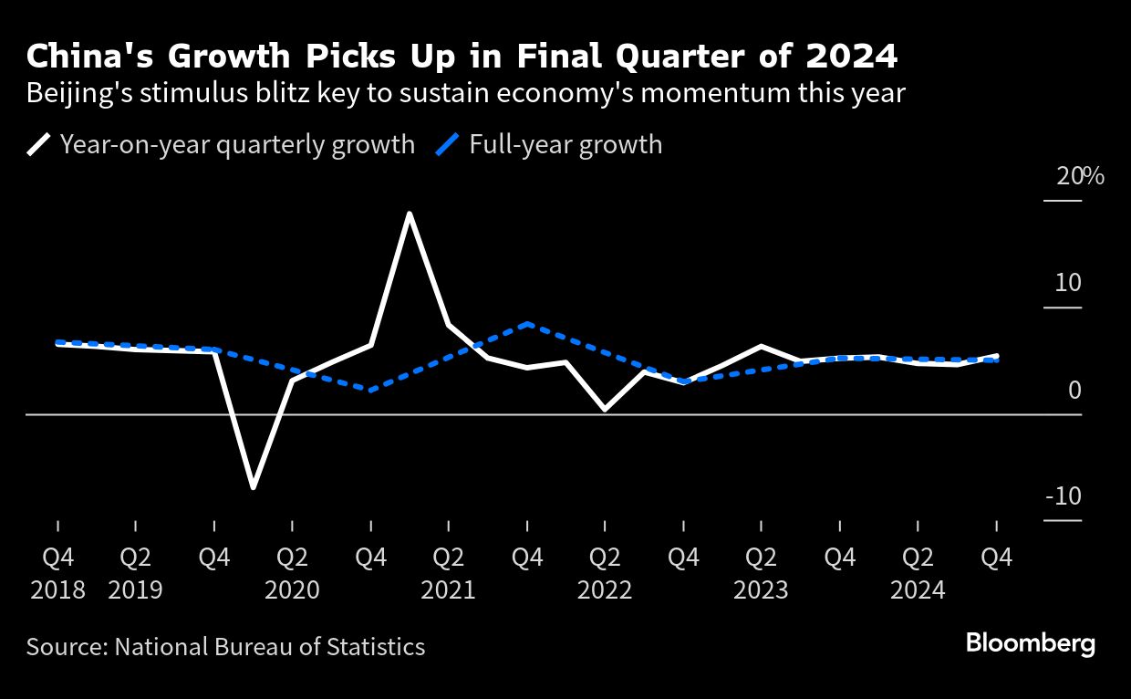 (Bloomberg) -- China's economic expansion met the government's annual target last year as recent stimulus measures bolstered growth in the final months of 2024.