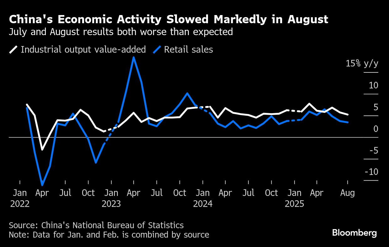 Industrial output and consumption had their worst month yet this year after a sharp slowdown in July. Production at Chinese factories and mines expanded 5.2% last month from a year earlier, according to data released by the National Bureau of Statistics on Monday, the smallest gain since August 2024.