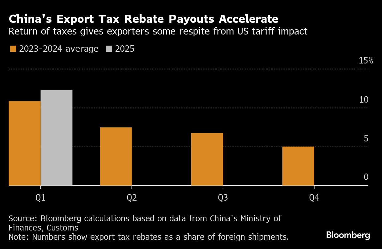 Part of the revenue shortfall likely stems from increased rebates for exporters and other tax breaks, with export tax rebates rising 14% from the same period a year earlier. Export-related tax returns as a share of foreign shipments climbed to 12.3% in January-March, pointing to faster payouts to help the finances of Chinese companies.