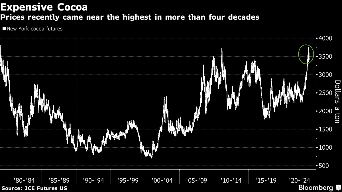 Cocoa prices have soared about 47% in the past year on fears that bad weather and crop disease will hurt output in Ivory Coast and Ghana, which make up two-thirds of world supply. An El Nino weather phenomenon could make matters worse, and analysts expect a third straight global shortage for the new season that's just starting.