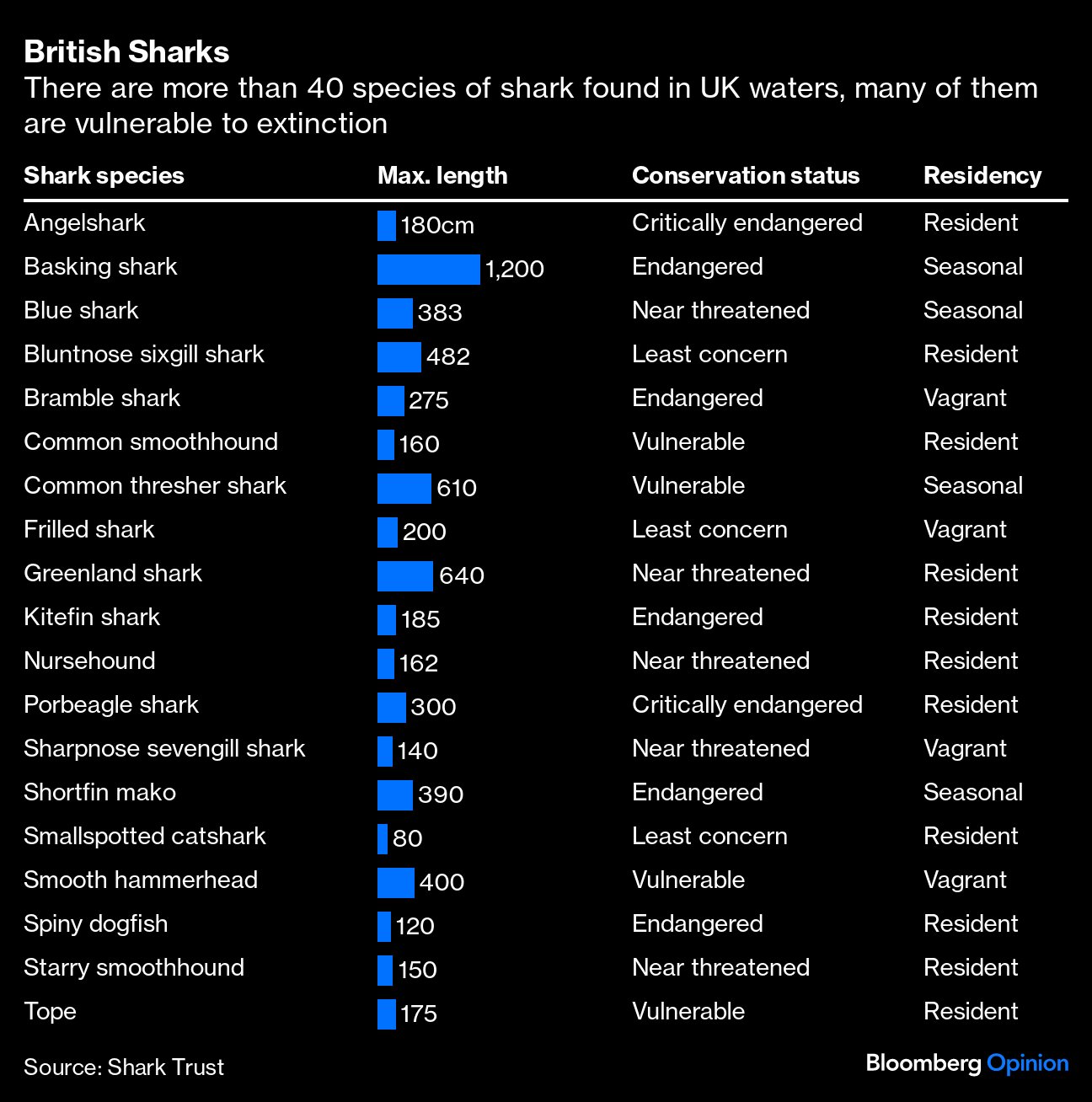 (Bloomberg Opinion) -- Just when you thought it was safe to get back in the water, a flood of news stories appear touting fears that great white sharks will start appearing off the coast of Cornwall in the UK as climate change warms the ocean. I'm more concerned about the sharks we already have.