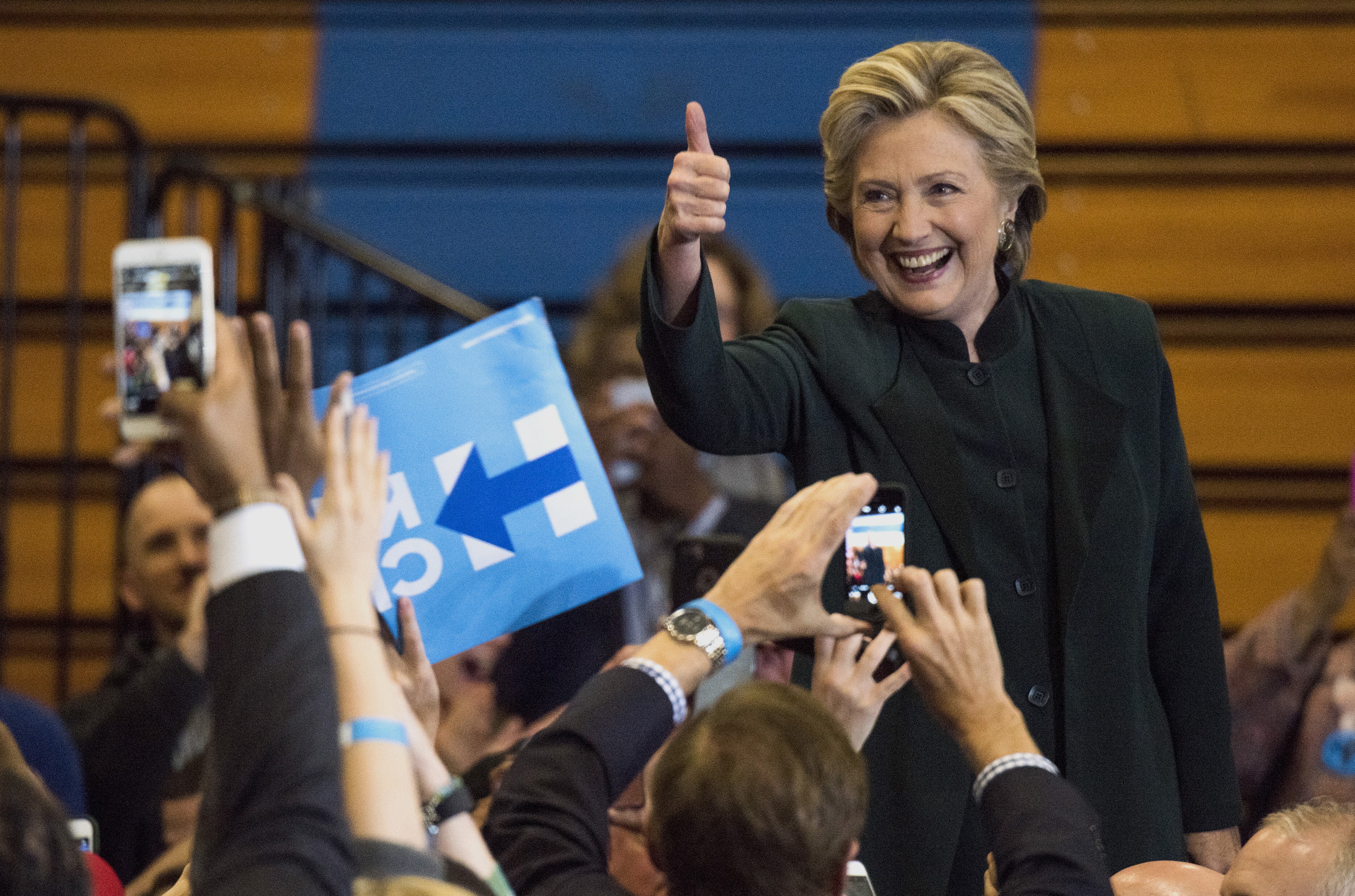 Hillary Clinton, 2016 Democratic presidential nominee, gives a thumbs up to the crowd right before walking off stage during a campaign rally (Photographer: Ty Wright/Bloomberg)