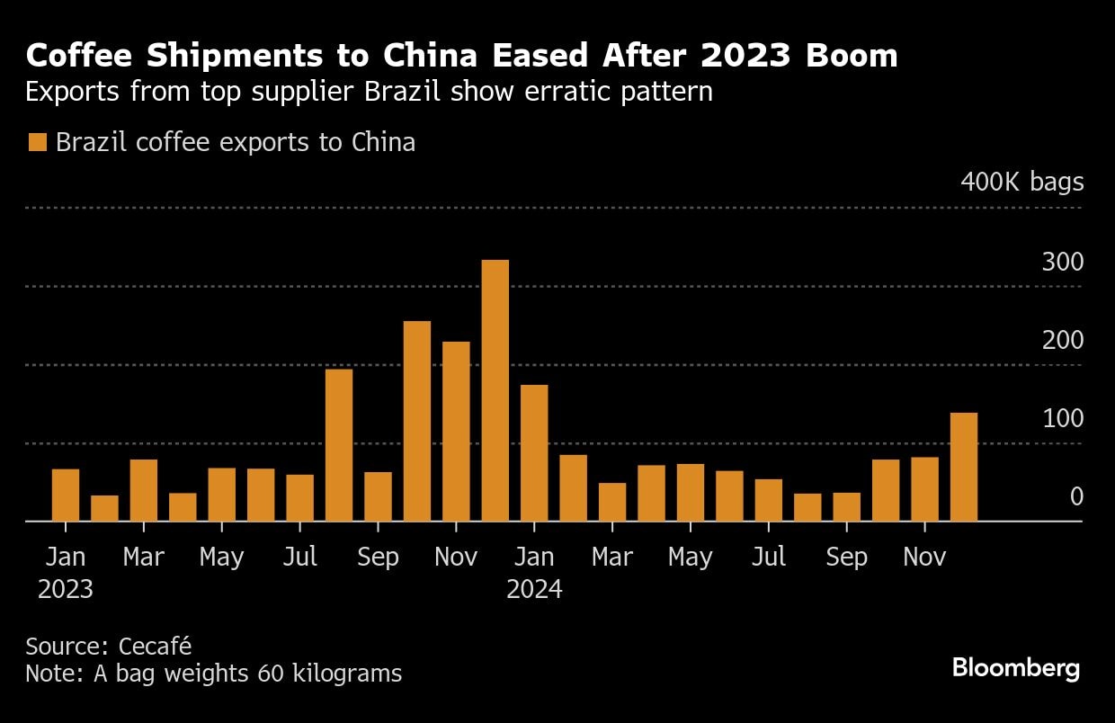 But in 2024, shipments from Brazil to China slowed, according to Cecafé, an exporters group in the South American nation. That came after a boom in 2023.