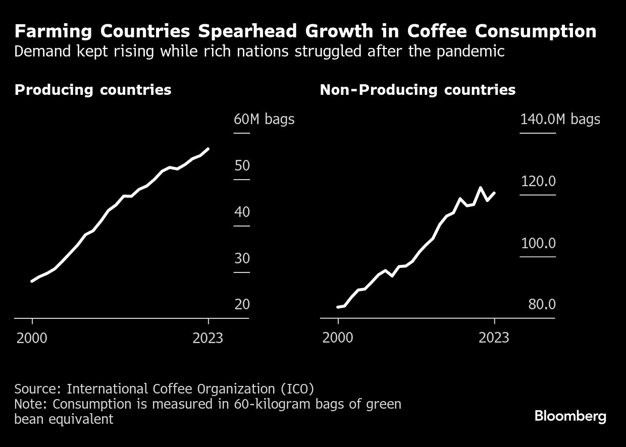 One interesting development in the market over recent years is that more coffee is being consumed in the countries that produce the commodity. Nearly one in three coffee bags are used in producing countries, a share that's been growing consistently, data from the International Coffee Organization show. And that's precisely where there are now big demand concerns.