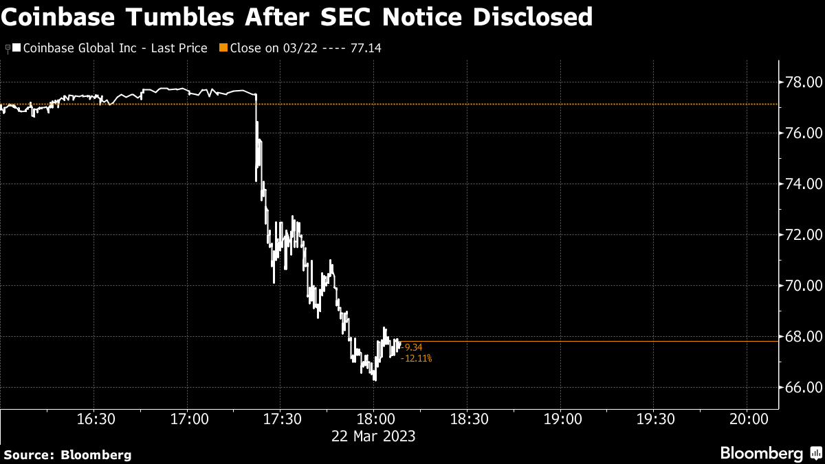 Coinbase shares slumped 12% in post-market trading in New York. Shares of the company have rebounded this year as Bitcoin climbed to more than $28,000, though the stock is still down more than 70% from its peak in November 2021.
