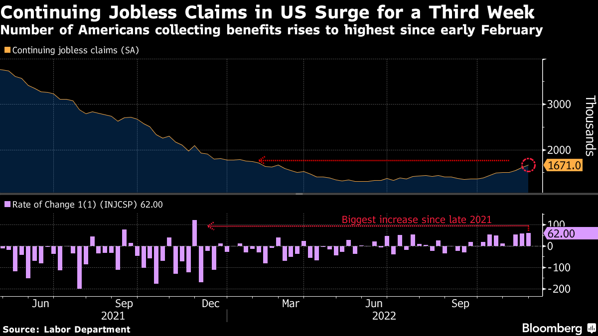 Recurring applications for US unemployment benefits rose to the highest since early February, suggesting that Americans who are losing their job are having more trouble finding a new one as the labor market shows tentative signs of cooling.