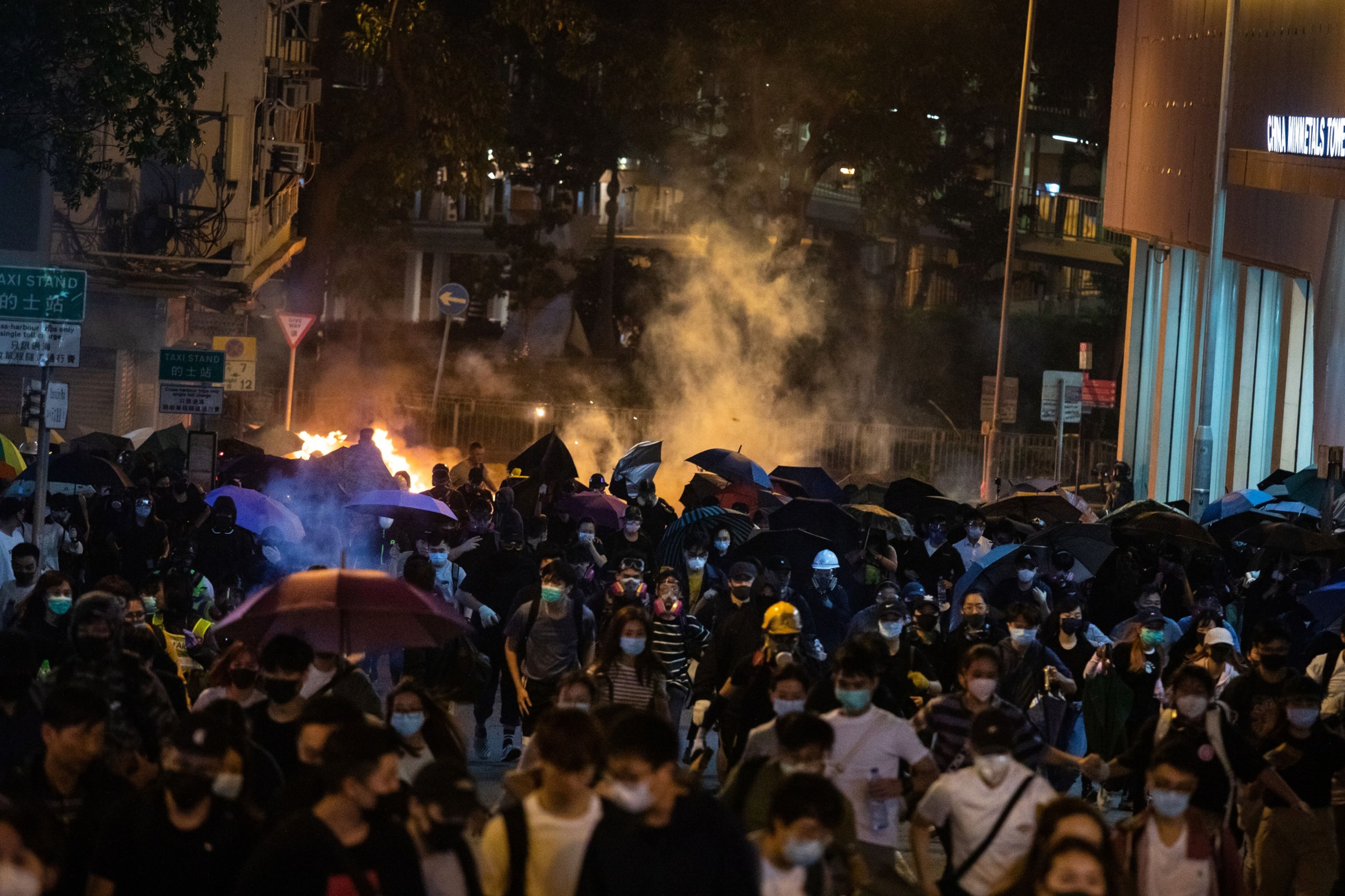 Demonstrators react after tear gas was fired by riot police during a protest in Tsim Sha Tsui district of Hong Kong, China. (Photographer: Kyle Lam/Bloomberg)