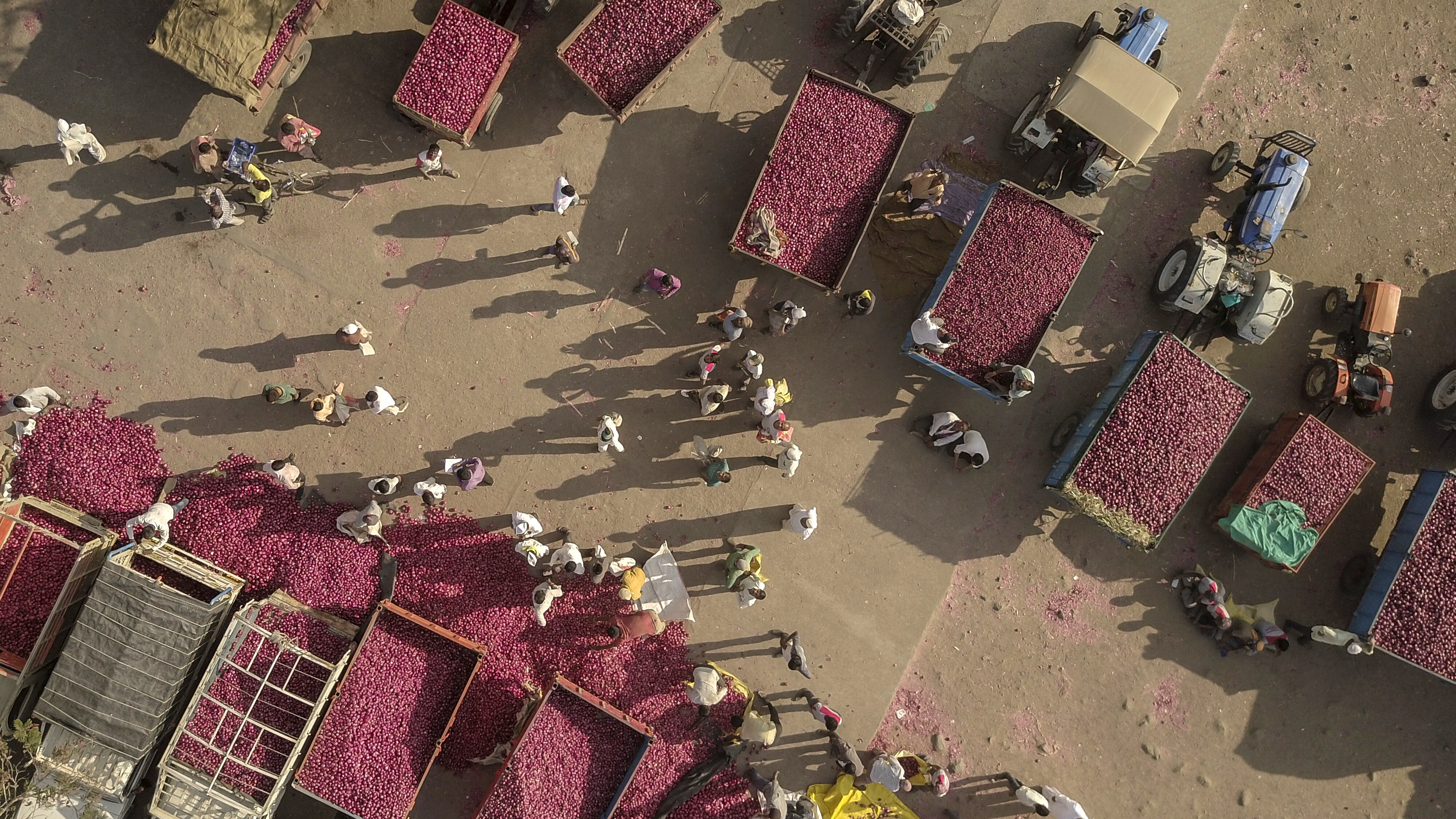 Trailers and trucks laden with onions stand at the APMC wholesale market in this aerial photograph taken in Lasalgaon (Photographer: Dhiraj Singh/Bloomberg)