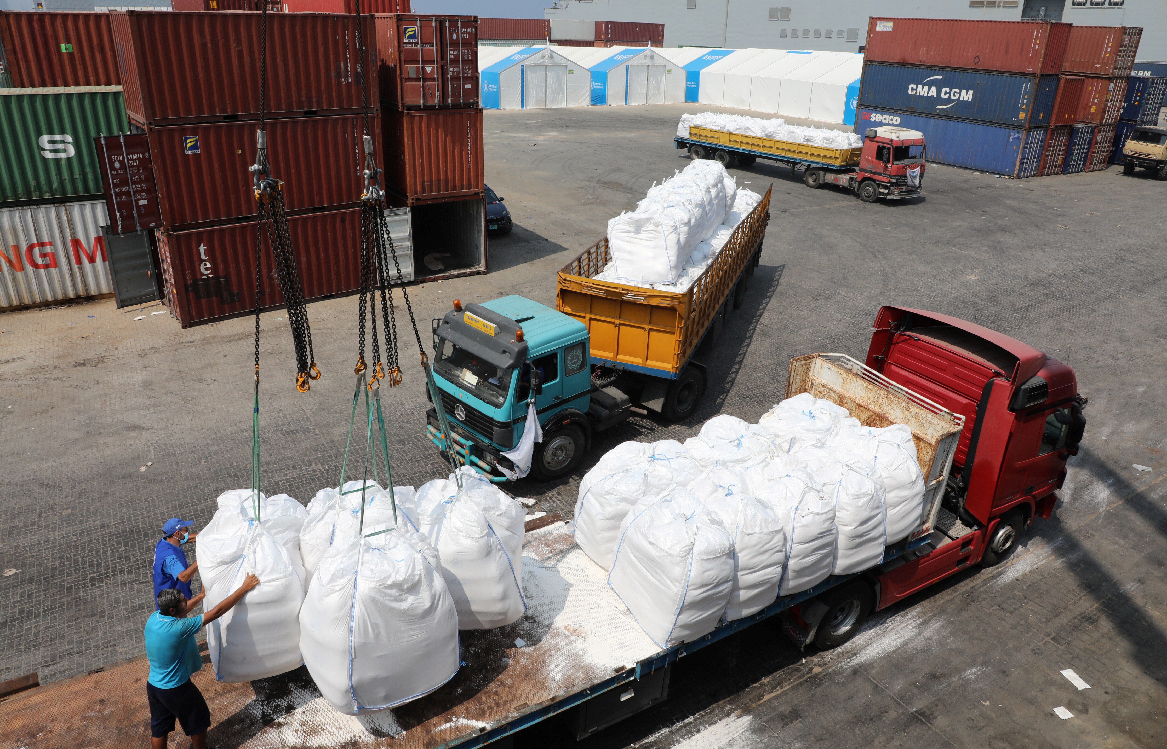 Humanitarian aid donated by World Food Program, are unloaded at Beirut's port. (Photo: REUTERS/Mohamed Azakir)