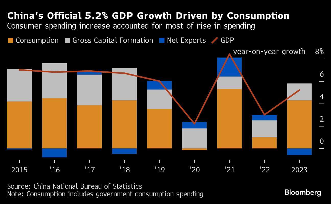 (Bloomberg) -- Longstanding suspicions about the accuracy of China's official GDP growth data have spurred a market for alternative calculations, which kicked into action this week after Beijing announced economic expansion for 2023 was in line with its annual target of around 5%.