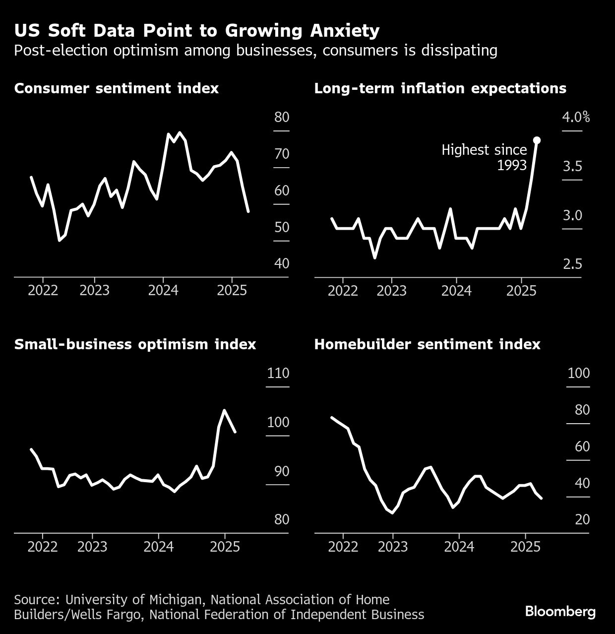 There was an initial surge of optimism in surveys of consumers, as well as small businesses and homebuilders, following Trump's election win on expectations he'd prioritize initiatives like tax cuts and deregulation. But the focus on tariffs, as well as a surge in prices of basic staples like eggs and the stock-market rout, is taking a toll on sentiment and inciting growth concerns.