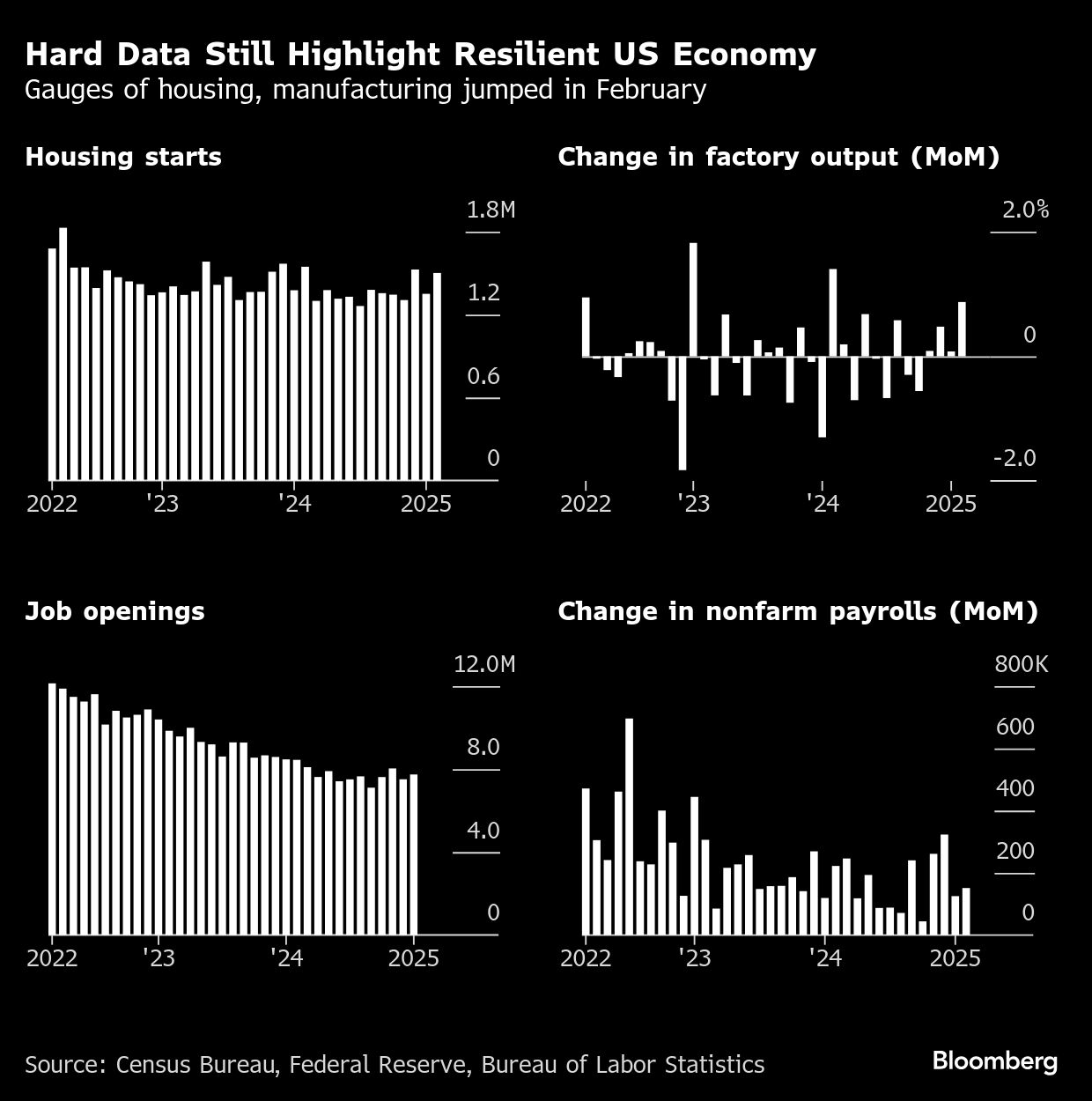 Other data have also been positive, but not without caveats. US factory output came in higher than expected in February, which economists largely said was indicative of manufacturers ramping up production to get ahead of tariffs. And while new home construction picked up last month, it was seen as a rebound from January's bad weather.