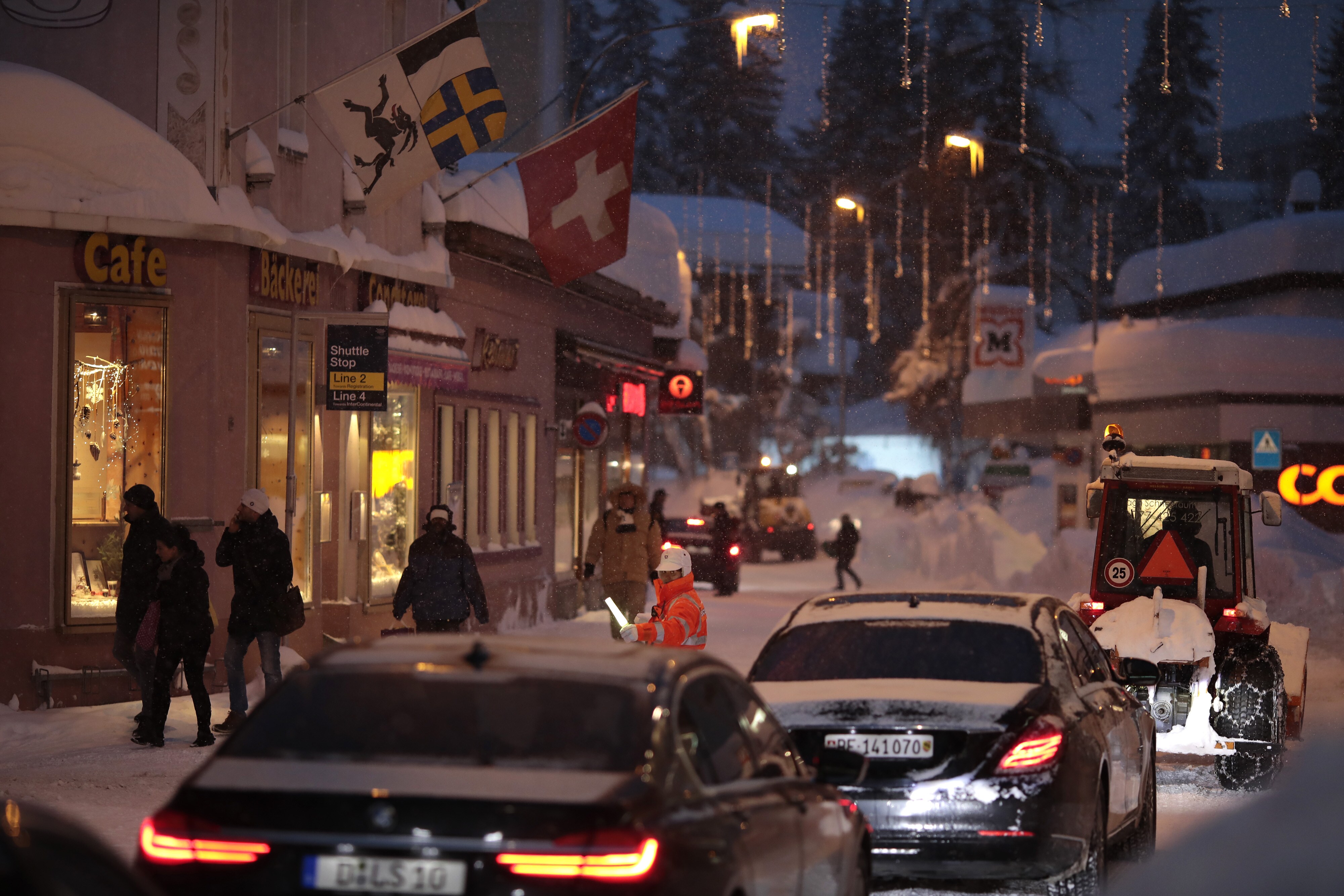 A road traffic officer stands and directs traffic through the streets ahead of the World Economic Forum in Davos. (Photographer: Jason Alden/Bloomberg)