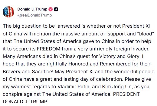 Many Americans died in China's quest for Victory and Glory. I hope that they are rightfully Honored and Remembered for their Bravery and Sacrifice! May President Xi and the wonderful people of China have a great and lasting day of celebration." [sic]