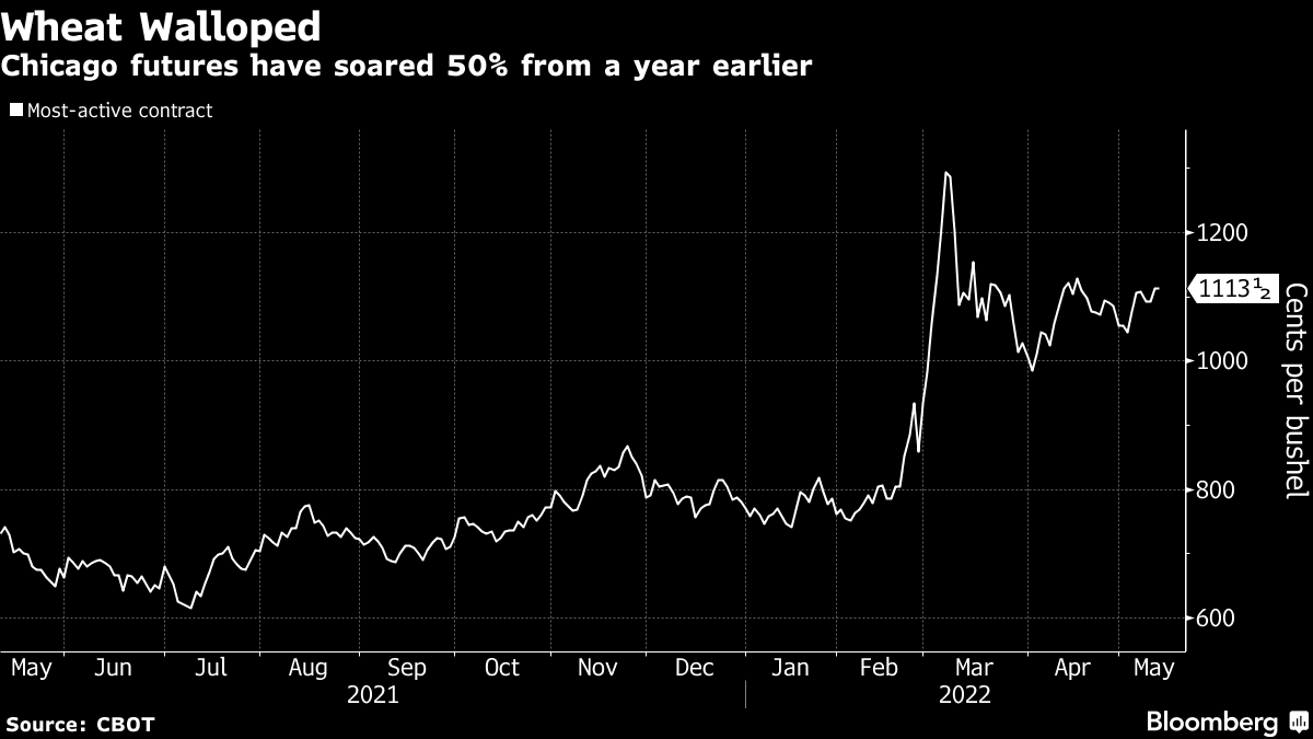 Wheat is hardy and its vast geographical spread typically means shortages in one place can be filled from elsewhere. But the litany of challenges is testing that resilience. Analysts expect world output to drop for the first time in four seasons, according to a Bloomberg survey before a U.S. Department of Agriculture report Thursday. That's likely to keep the price of many food staples high as hunger and cost-of-living crises deepen from Africa to Europe.