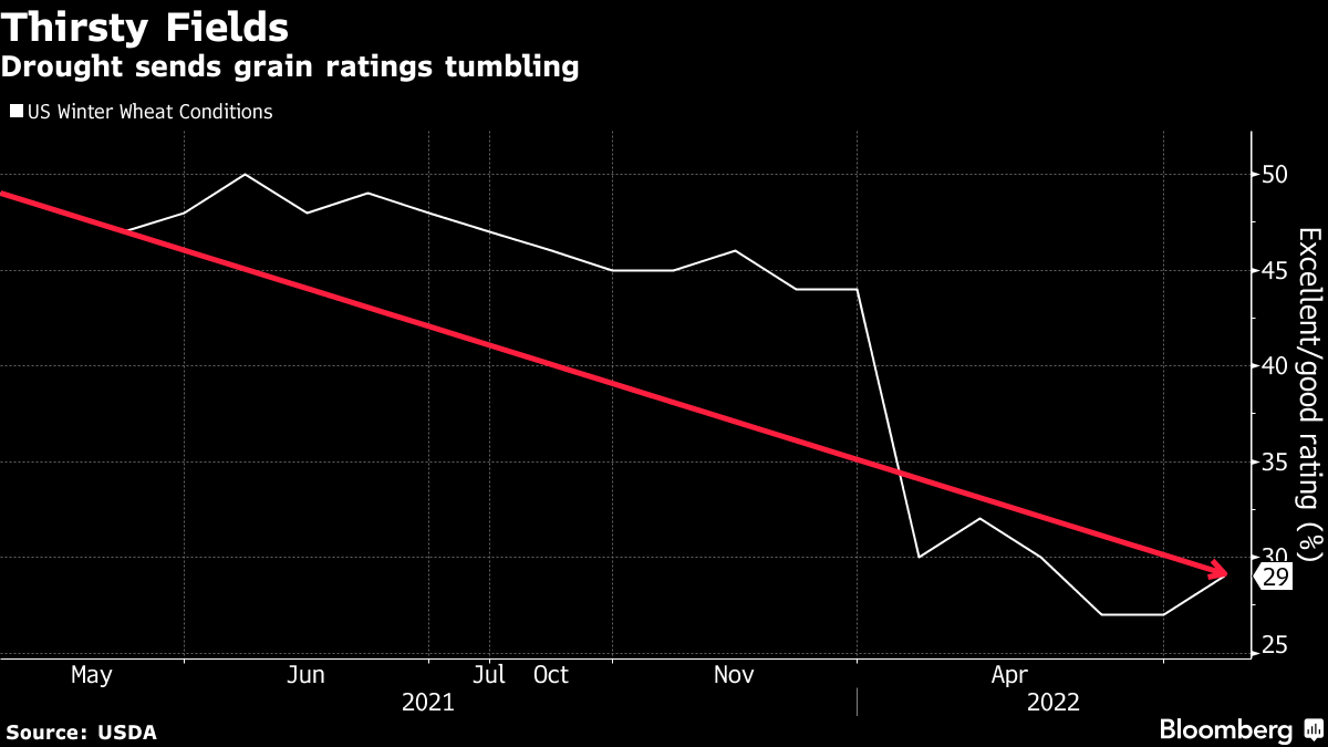 The supply pinch threatens to send elevated grain prices even higher, worsening inflation across supply chains and hurting US exports. “Everything west of the Mississippi River needs rain,” Harries said. “If we don't have those regular showers, the size of the crop will get smaller every day.”