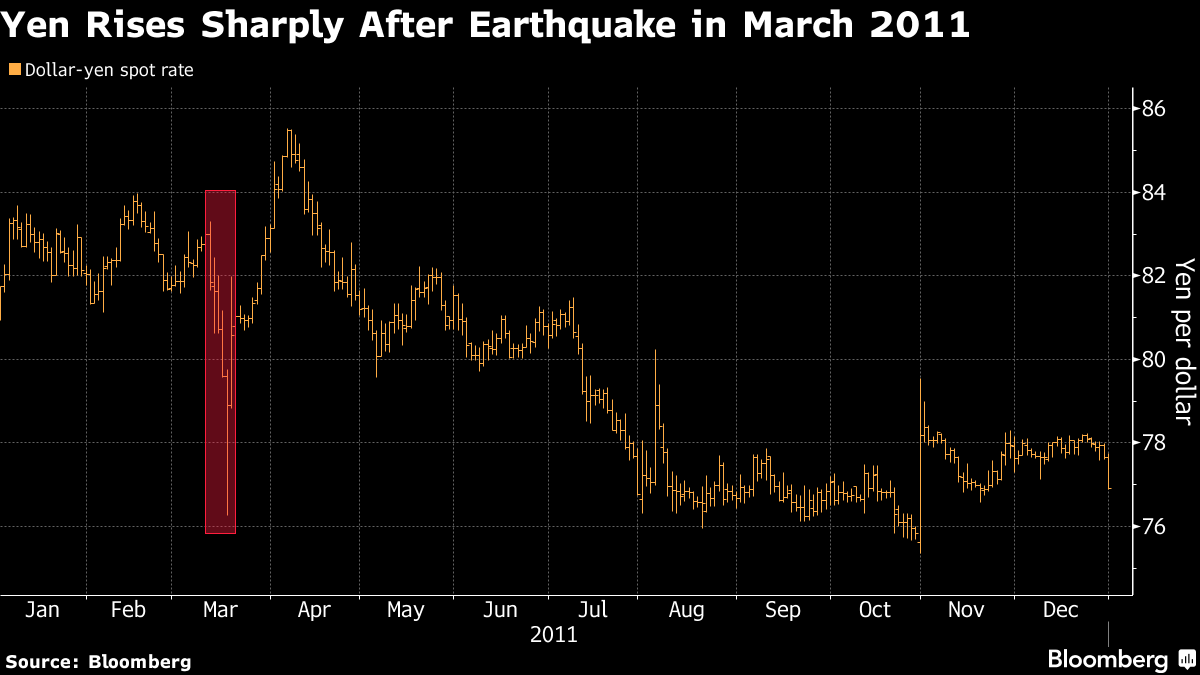The yen's decline following the major tremor is contrary to what happened in March 2011, when a deadly earthquake and tsunami triggered coordinated intervention to sell the yen by Japan, the US and Europe. That move aimed to halt a sharp rally in the yen on the back of repatriation of assets held overseas by Japanese companies.