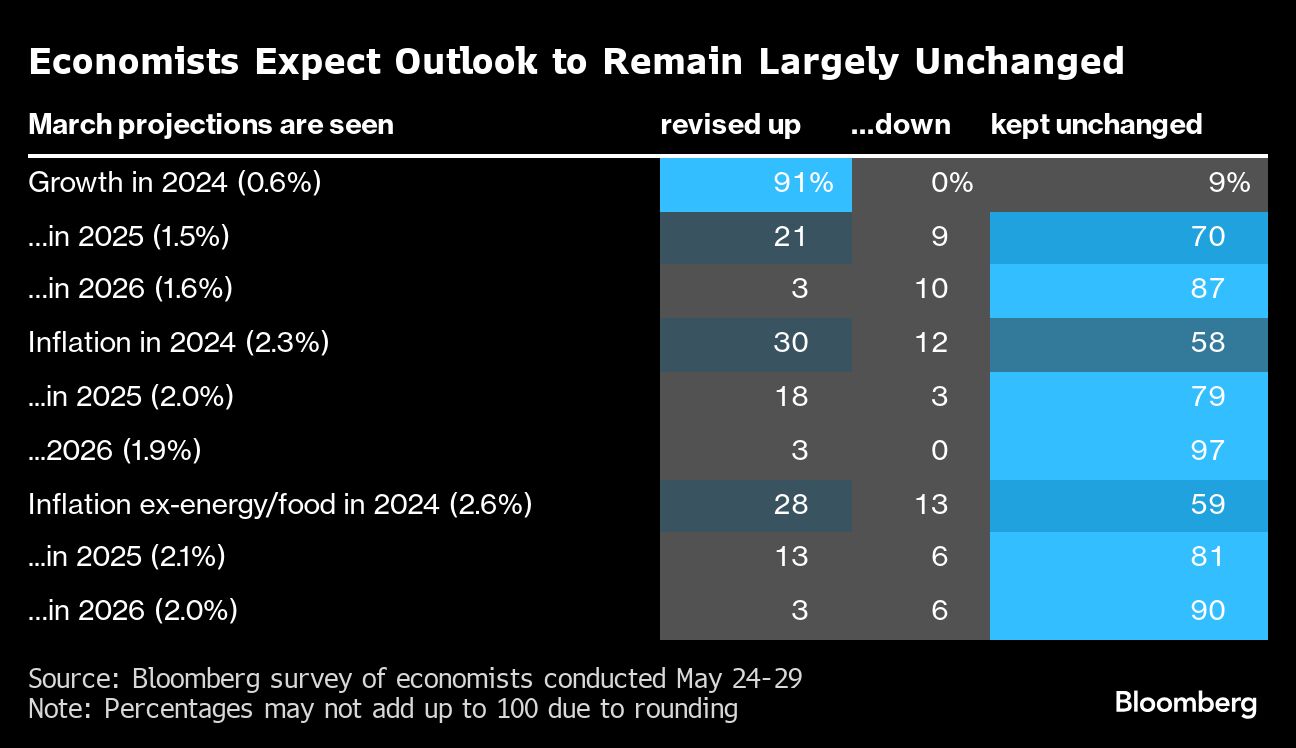 Economists don't expect material shifts in this round of ECB forecasts, which they reckon will again show inflation returning to target in 2025. There may be an upward revision for growth this year, however, after first-quarter gross domestic product topped estimates.
