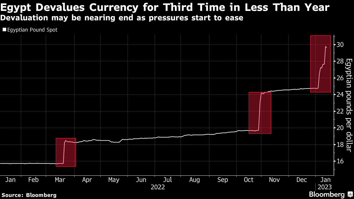 Foreign exchange was scarce for months in Egypt as the economy of the Middle East's most populous country contended with the rising cost of commodities from food to fuel, triggered by Russia's invasion of Ukraine. The pound has lost about 33% of its value since late October, when Egypt said it would embrace a flexible exchange rate, a move that helped it clinch a $3 billion loan from the International Monetary Fund.
