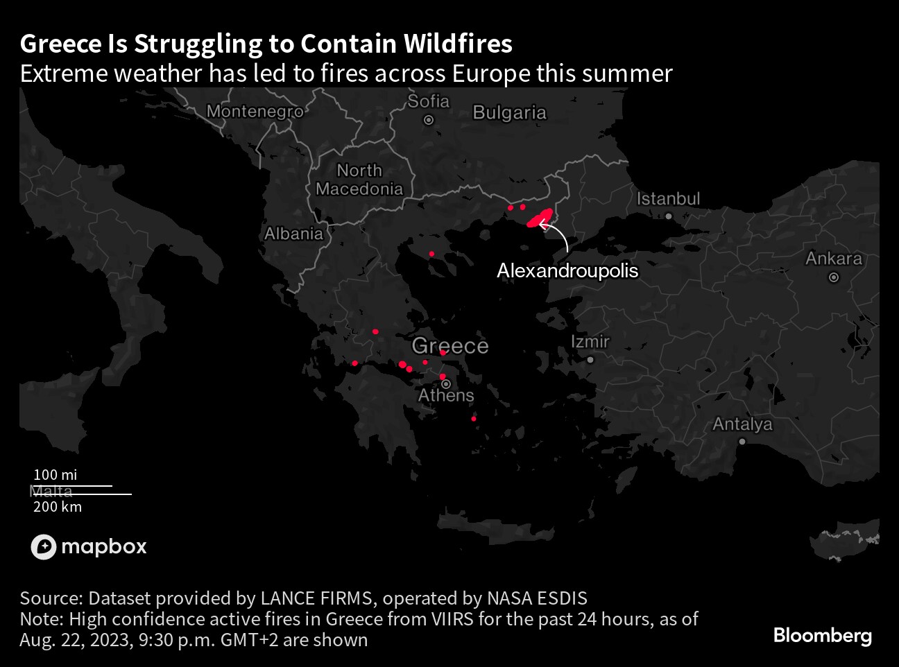 (Bloomberg) -- Eighteen people were found dead in the Dadia forest in northeast Greece as firefighters struggle to contain wildfires blazing across the country.