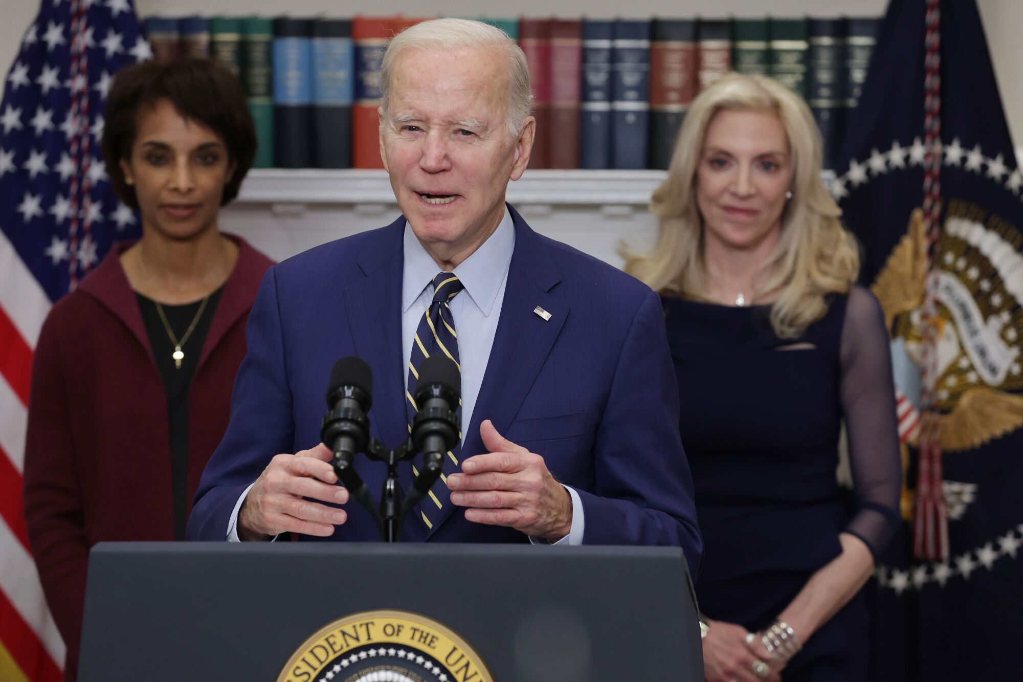 WASHINGTON, DC - MARCH 10: U.S. President Joe Biden (C) delivers remarks on the February jobs report with Council of Economic Advisers Chair Cecilia Rouse (L) and National Economic Council Director Lael Brained in the Roosevelt Room at the White House on March 10, 2023 in Washington, DC. According to the Labor Department, U.S. employers added 311,000 jobs in February and the unemployment rate rose to 3.6%, two-tenths higher than in January. (Photo by Alex Wong/Getty Images)