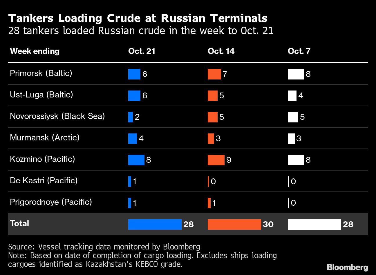 A total of 28 tankers loaded 20 million barrels of Russian crude in the week to Oct. 21, vessel-tracking data and port agent reports show. That's down by 2.1 million barrels. Destinations are based on where vessels signal they are heading at the time of writing, and some will almost certainly change as voyages progress. All figures exclude cargoes identified as Kazakhstan's KEBCO grade.