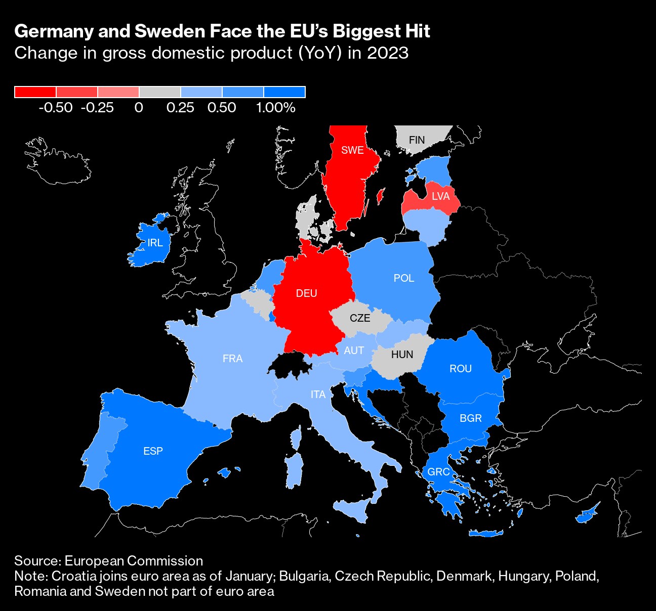 Germany, the region's biggest economy, will shrink more than any other euro-zone member in 2023, the forecasts show. In the wider EU, the only other country seen suffering as badly is Sweden.