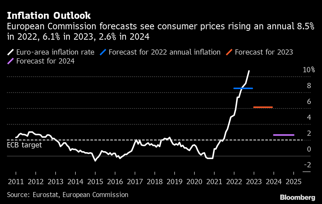 The economy confronting them is buckling under the crushing weight of inflation that reached a new euro-era high of 10.7% in October. The Commission reckons price growth will now average 8.5% this year and 6.1% in 2023 -- both markedly higher predictions than made in July.