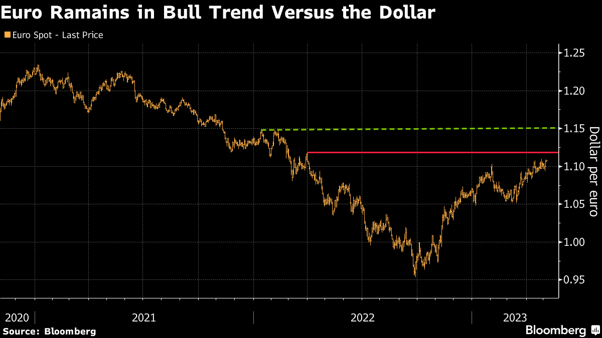 (Bloomberg) -- The euro will likely advance to its highest level since 2021, as the dollar is set to weaken with the Federal Reserve signaling a pause in rate hikes and the European Central Bank continuing to tighten policy, according to Deutsche Bank AG.