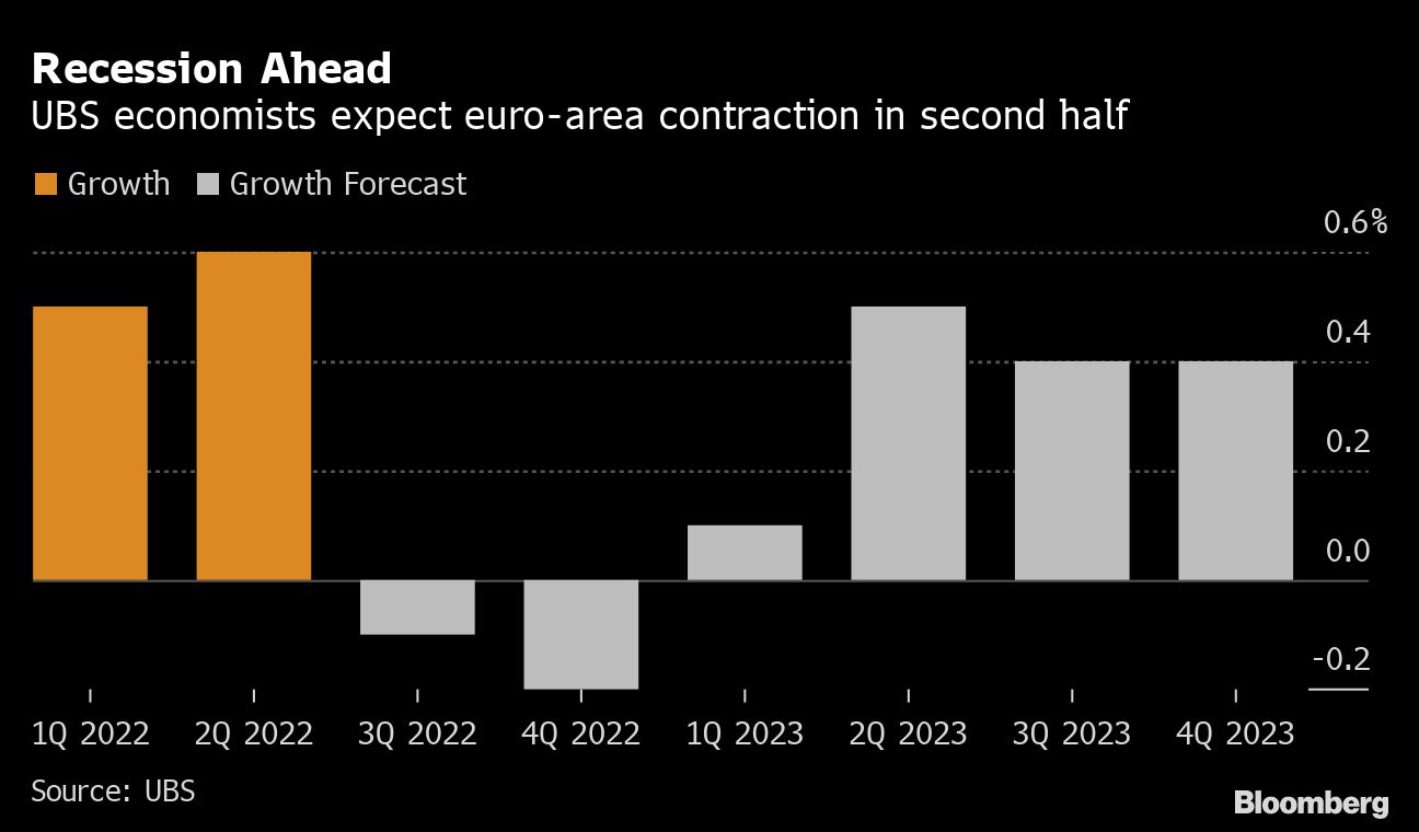(Bloomberg) -- The euro area has already entered a “shallow” recession that's been triggered by surging energy prices and will last through year-end, according to economists at UBS Group AG.