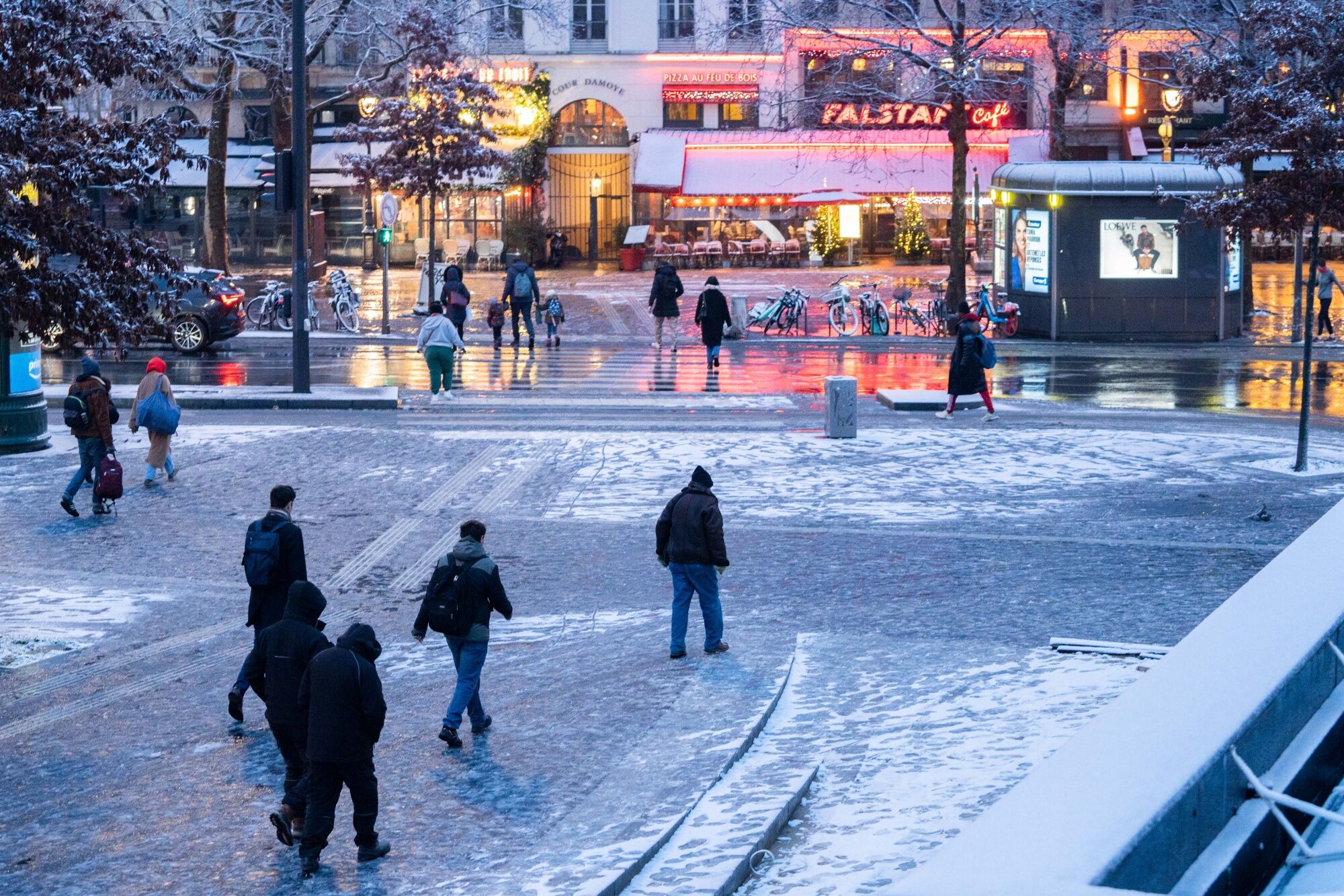 Pedestrians walk across icy ground near the Place de la Bastille in central Paris, France, on Thursday, Jan. 18, 2024. Heavy snow and ice is gripping northern Europe, triggering further weather warnings as transport systems are disrupted.