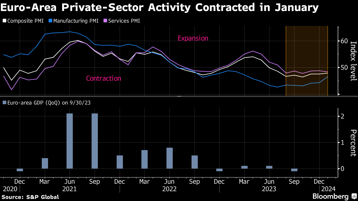 “The euro-area composite PMI will probably make the European Central Bank think that resisting interest-rate cuts until June is the right course of action. The survey suggests the economy of the monetary union isn't collapsing under the weight of higher borrowing costs, despite weakness in the bloc's two largest economies, and inflation is proving difficult to tame”