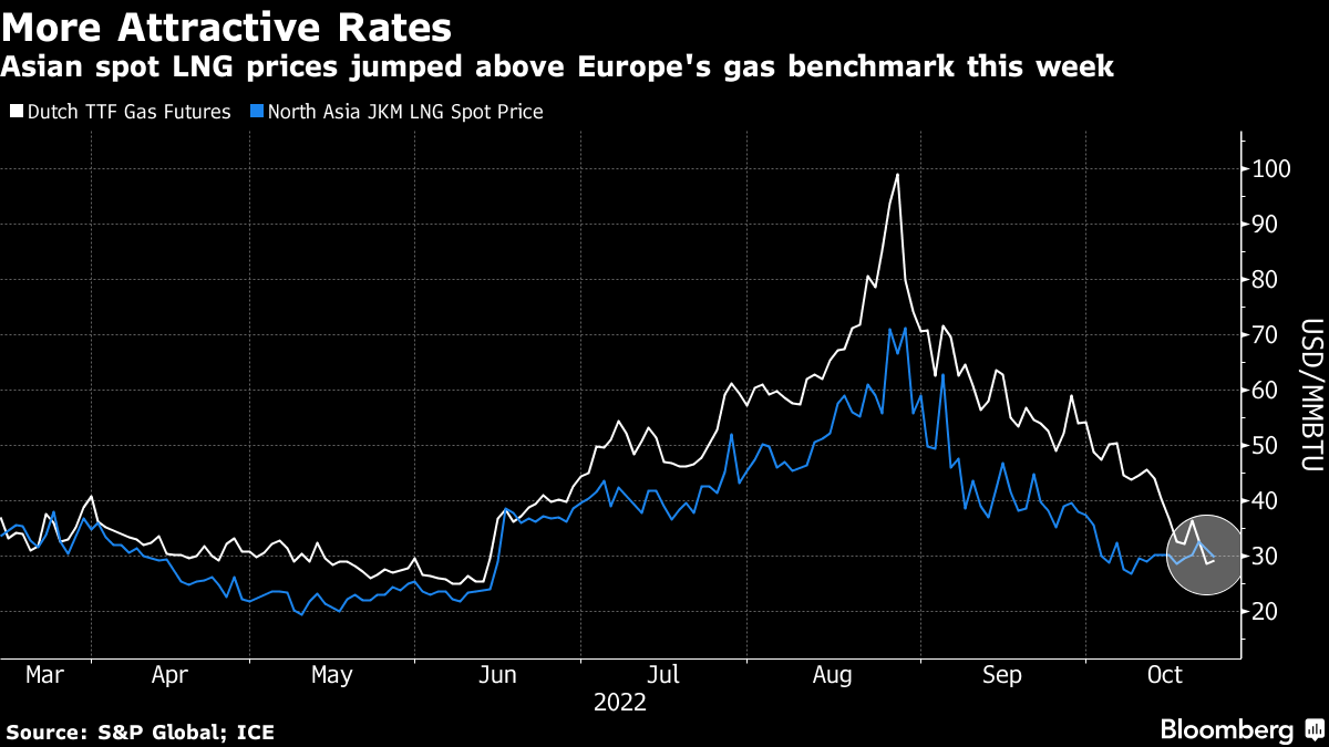 This is a reversal: For much of the year, Europe had been frantically hoarding LNG supply as a means to replace a drop in Russian pipeline gas deliveries. That was leaving less fuel for top Asian importers, like Japan and South Korea, as higher gas prices in Europe attracted more cargoes to the continent.