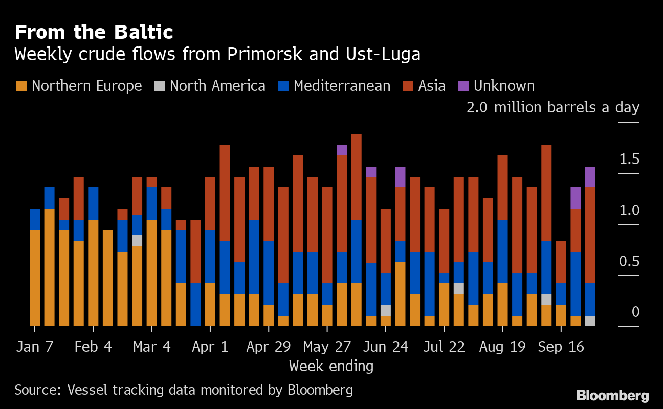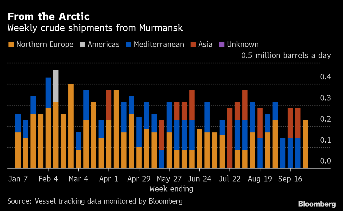 The volume shipped from Russia to northern European countries fell below 200,000 barrels a day on average in the four weeks to Sept. 30. Total shipments to northern Europe and the flow to storage tanks in Rotterdam both set new lows for the year so far.