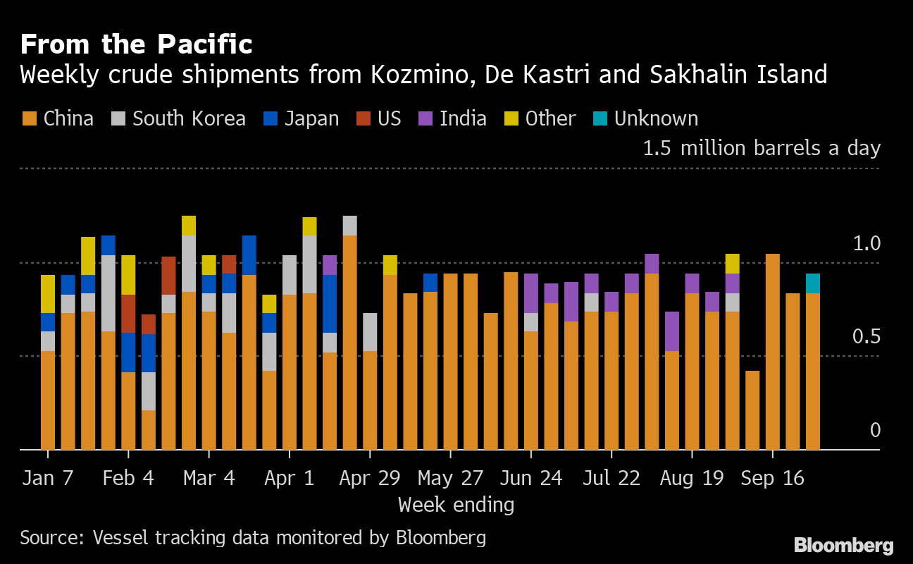 Crude flows from Russia's eastern oil terminals edged higher in the week to Sept. 30. Eight cargoes of ESPO and one of Sakhalin Blend crude were loaded, with all but one of the cargoes heading to China. The other ship is yet to show a destination, but is most likely heading for India.