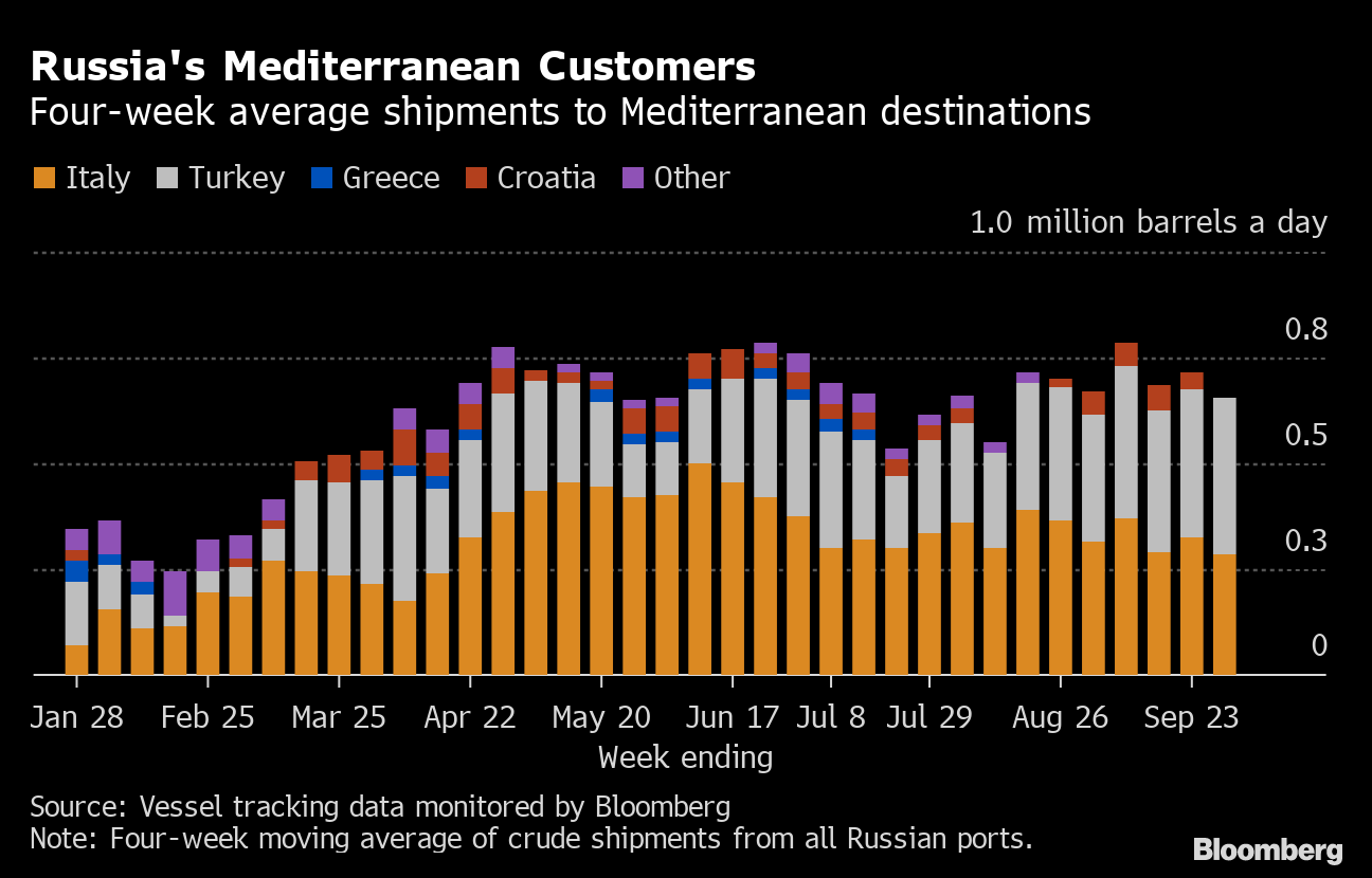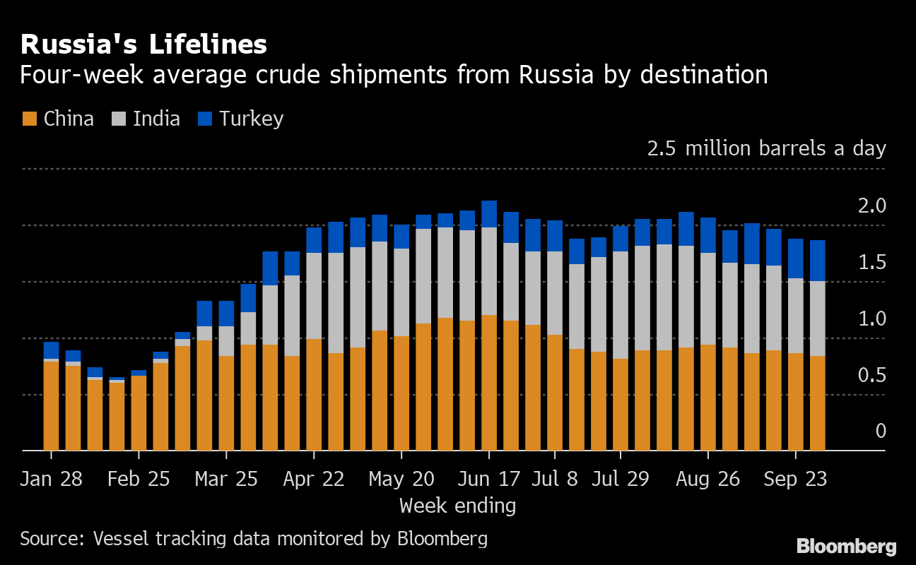 Meanwhile the diversion of crude flows from Europe to Asia appears to have reached a plateau. Flows to the big three buyers of Russian barrels — China, India and Turkey — which initially stepped in to fill the gap after European buyers started to shun Moscow's exports, peaked in June at 2.2 million barrels a day. In the four weeks to Sept. 30 that figure was down by about 350,000 barrels a day.