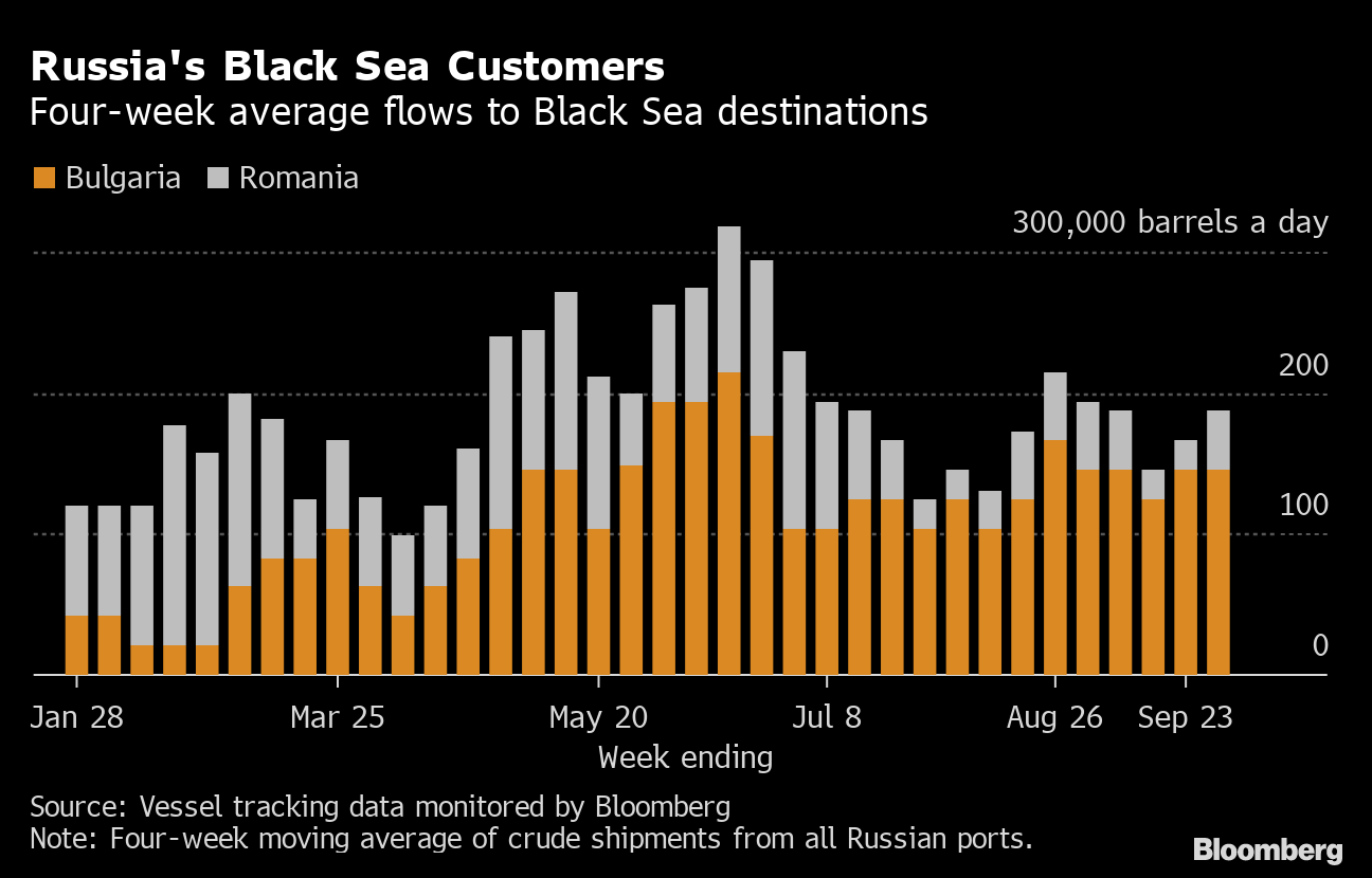 At 660,000 barrels a day, Russia's seaborne crude exports to European countries fell to their lowest for the year so far in the four weeks to Sept. 30, dropping by 136,000 barrels a day, or 17%, from the period to Sept. 23. A small increase in flows to buyers in the Black Sea region was more than outweighed by the continuing decline in volumes to northern Europe. These figures do not include shipments to Turkey.