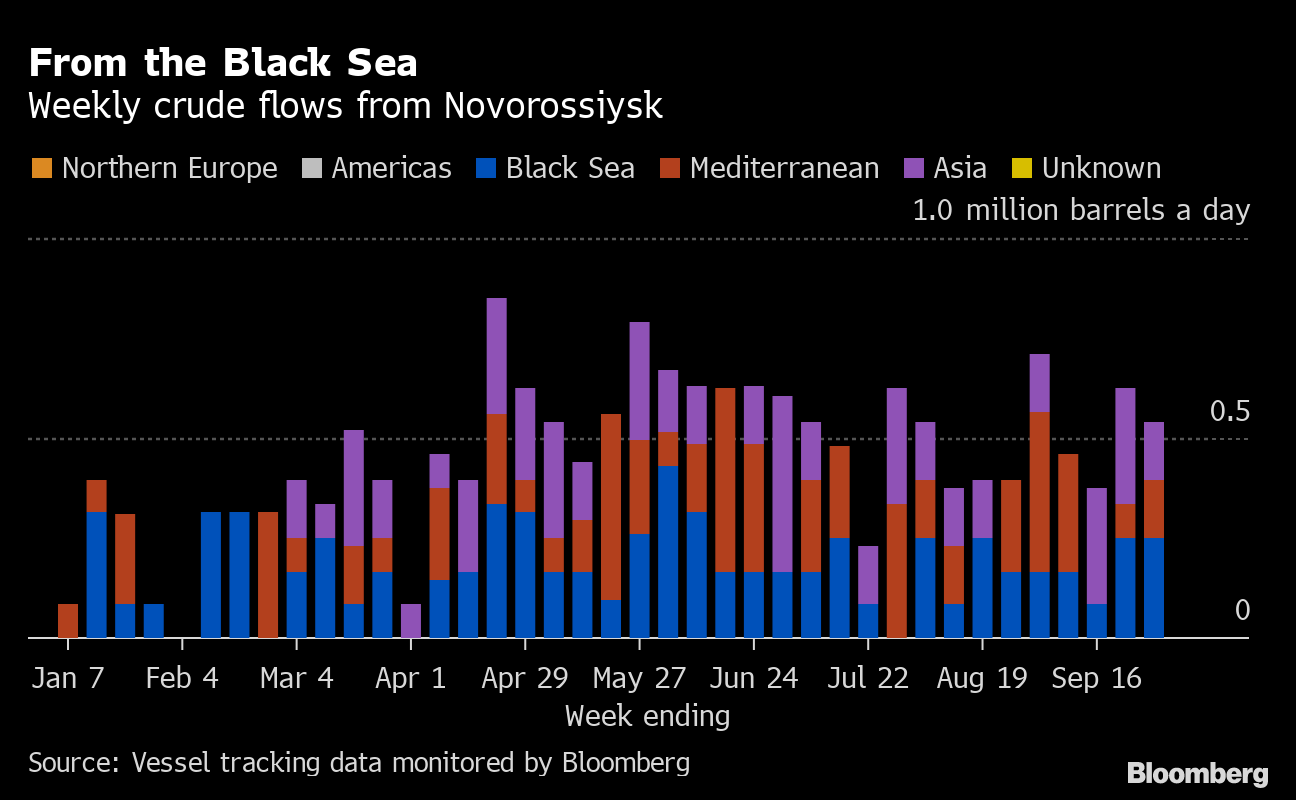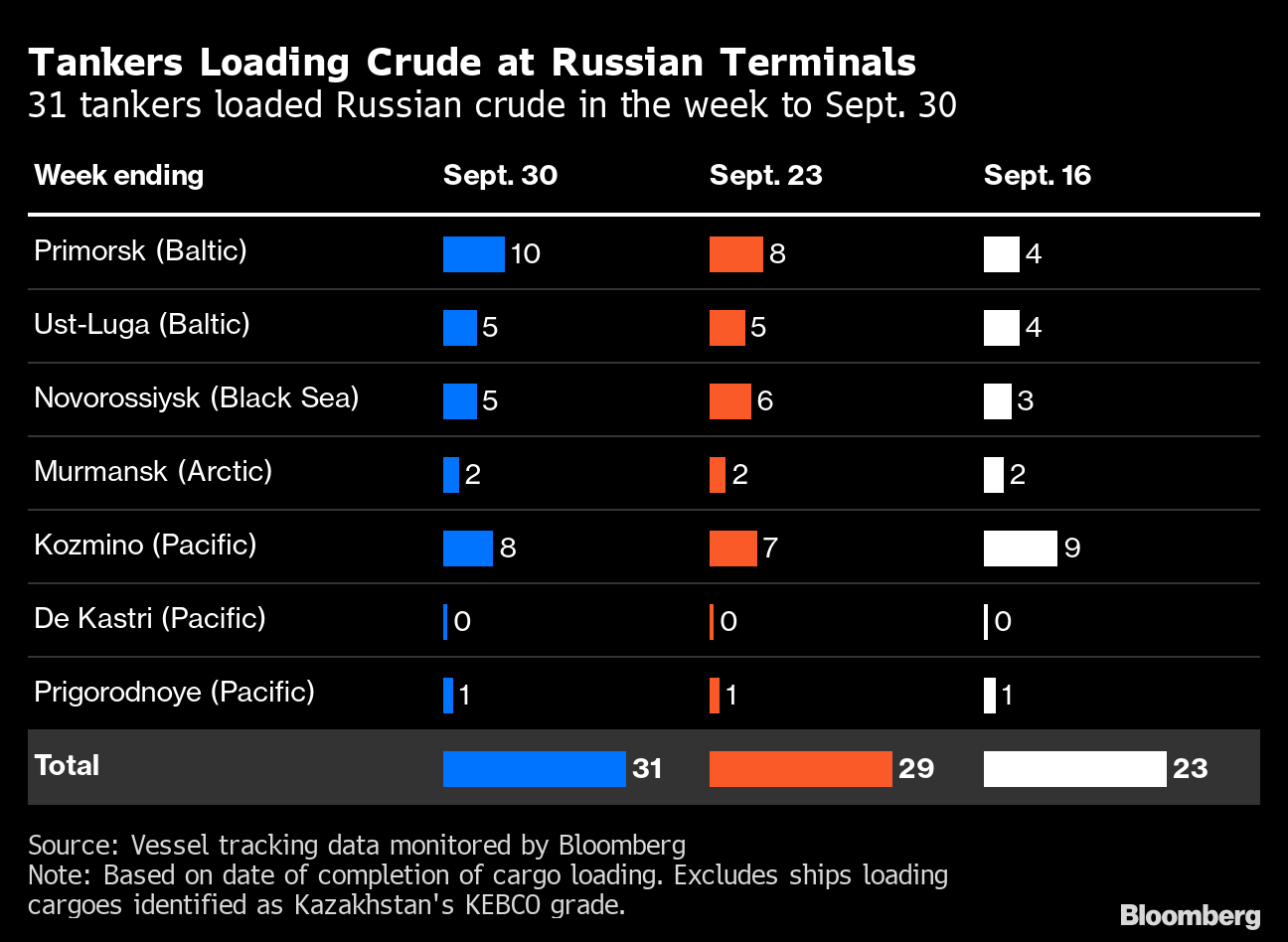 A total of 31 tankers loaded 22.9 million barrels of Russian crude in the week to Sept. 30, vessel-tracking data and port agent reports show. That's up by 1.2 million barrels, to a four-week high. Destinations are based on where vessels signal they are heading at the time of writing, and some will almost certainly change as voyages progress. All figures exclude cargoes identified as Kazakhstan's KEBCO grade.