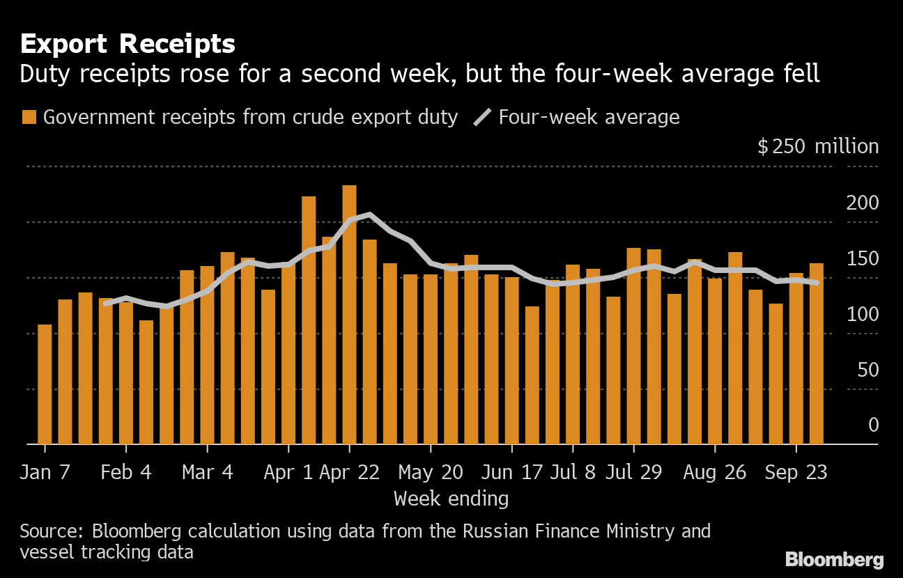 Inflows to the Kremlin's war chest from its crude-export duty edged up alongside higher volumes, rising to a four-week high of $162 million in the seven days to Sept. 30. But the four-week average income moved in the opposite direction, dropping to a 13-week low of $145 million.