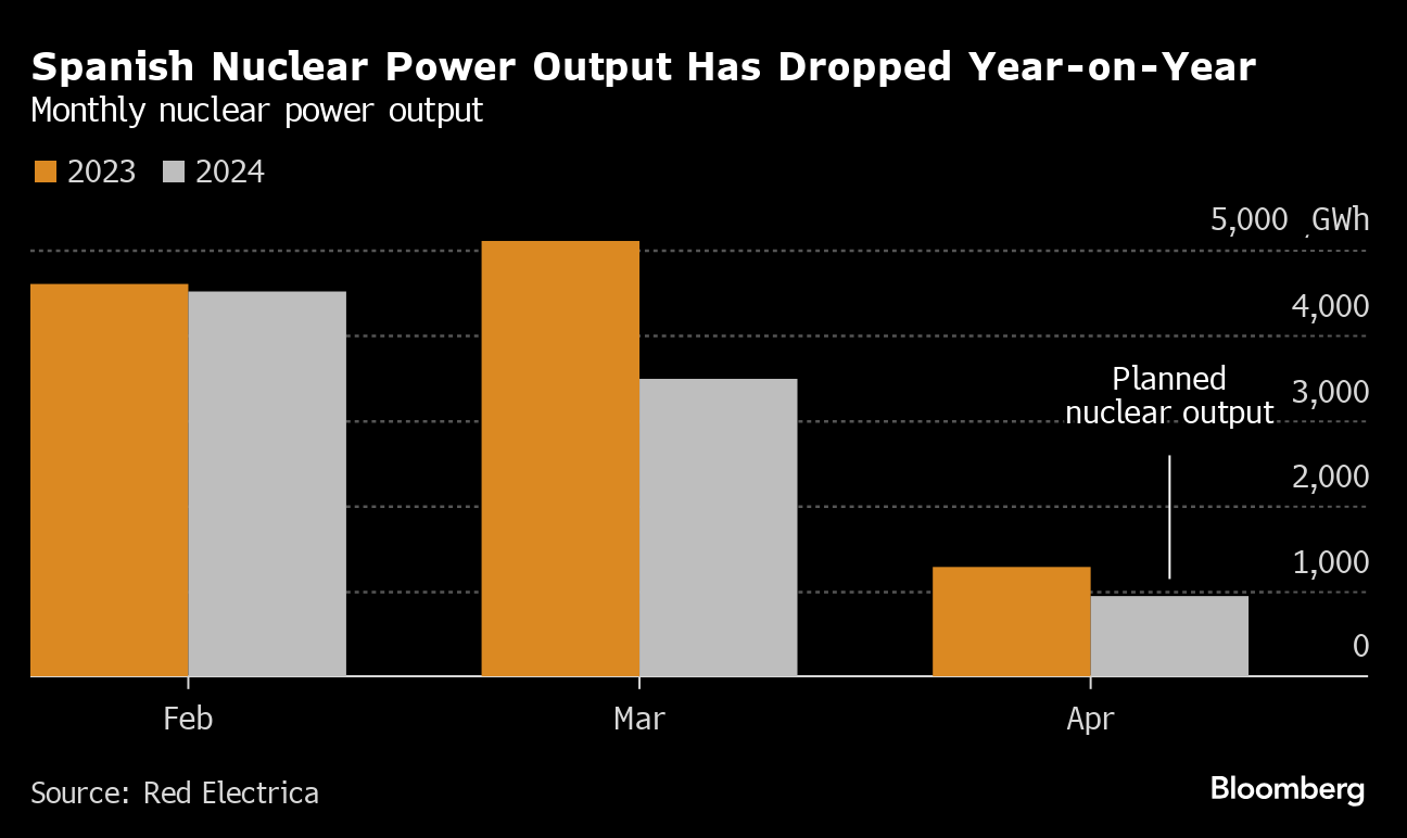 To the south in Spain, electricity prices for Friday plunged to the lowest level since 2013 and have barely settled above zero for weeks. The country's Asco I and Asco 2 reactors cut output on a regular basis in the past five weeks. In the Nordic region, operators are also curbing output more often.