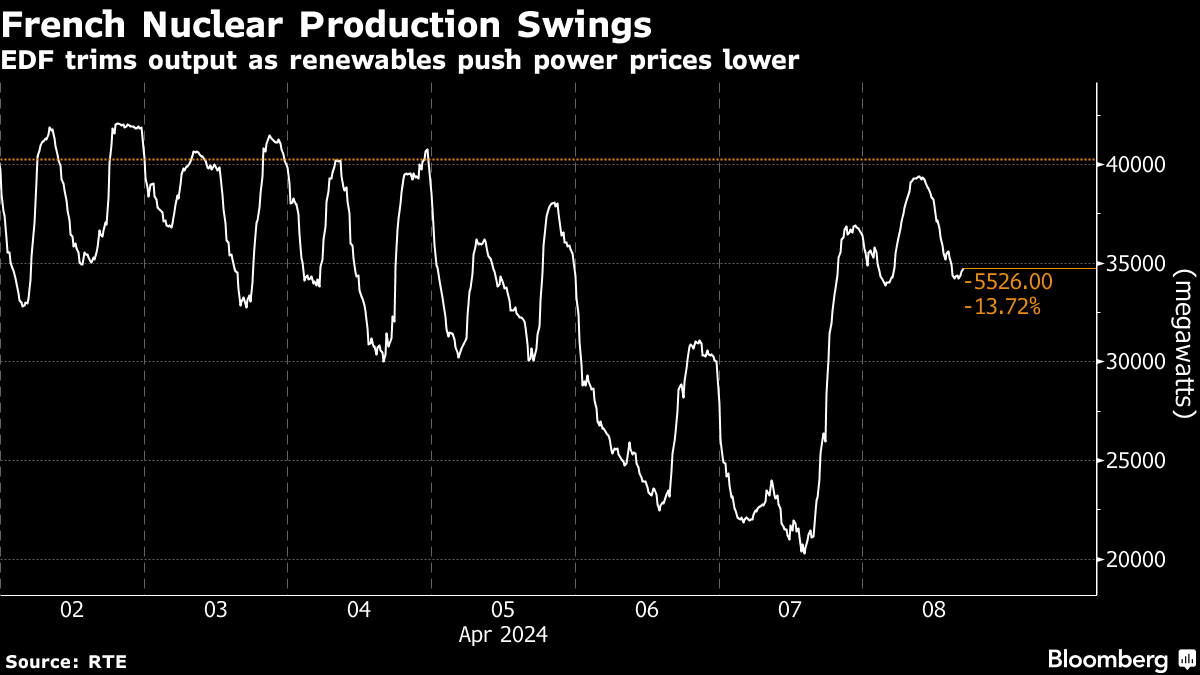 Electricite de France SA, which is just getting its fleet of nuclear plants back on track after years of lengthy outages for repairs and checks, has already had to reduce output and halt plants, or extend stoppages. Over the weekend, the firm idled half a dozen plants as prices turned negative.