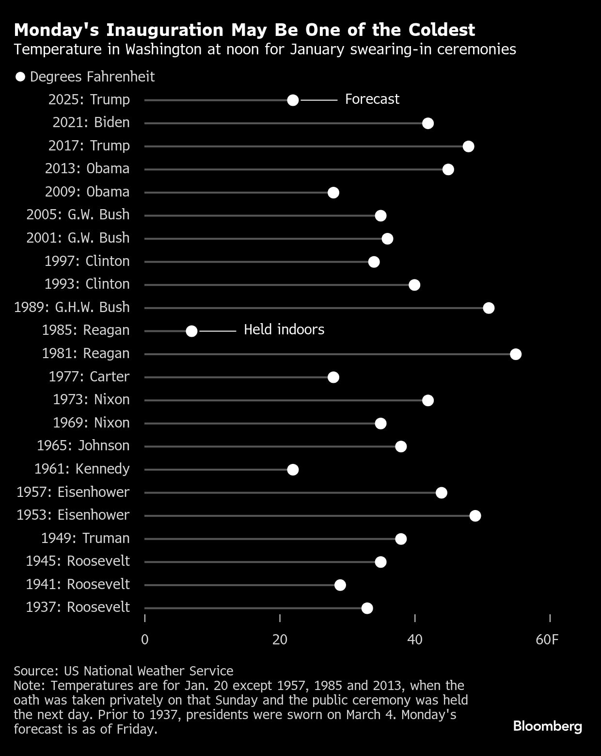 On Jan. 21, 1985, Ronald Reagan's second inaugural ceremony was moved indoors, with the thermometer hitting 7F at noon that day, and afternoon wind chills as low as -20F. The next coldest January swearing-in was John F. Kennedy's at 22F in 1961.