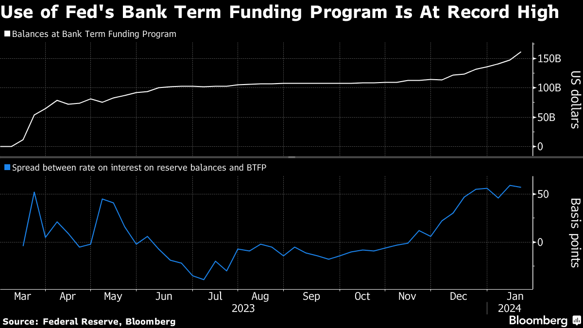 Data from the Fed showed a record high $162 billion in borrowing from the BTFP in the week through Wednesday, Jan. 17. That compares to the previous all-time high of $147 billion reached the week prior.