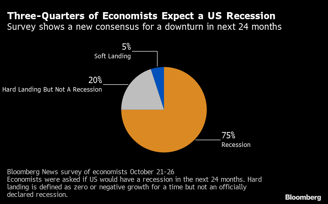 Powell and his colleagues have not given up hope that they can pull off a soft landing for the economy. But for the first time in the pre-FOMC meeting surveys, a majority of the economists -- three-quarters -- see a recession as likely over the next two years, and most of the rest see a hard landing with a period of zero or negative growth ahead.