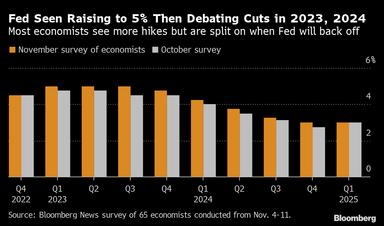 The Federal Open Market Committee will raise rates an additional percentage point over the next several meetings to confront inflation near a 40-year high, according to a Bloomberg survey of 65 economists that took place Nov. 4-11.