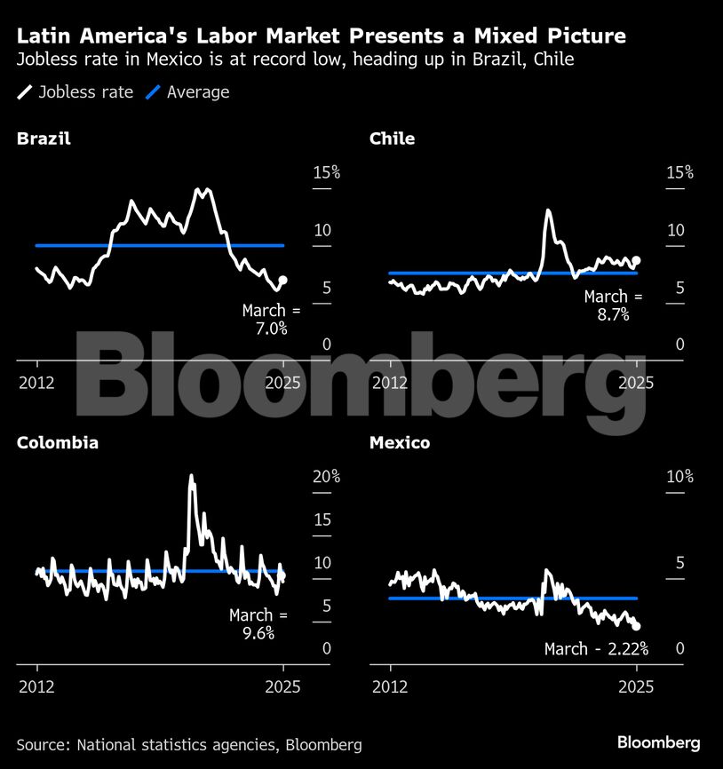Joblessness is drifting higher in Chile and Brazil — though below what many Brazil watchers see as the economy's non-accelerating inflation rate of unemployment — while ticking lower in Colombia. Mexico's March unemployment rate of 2.22% was a record low.